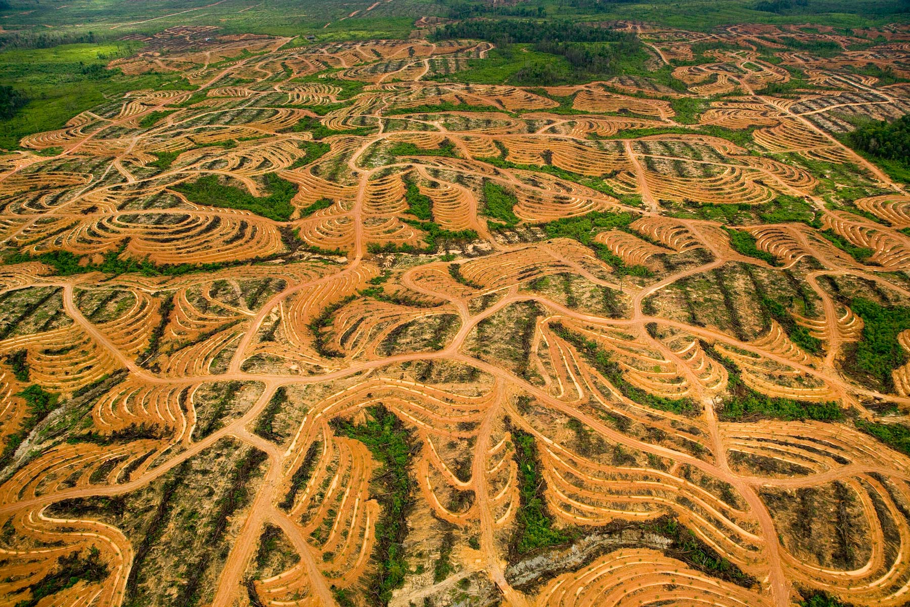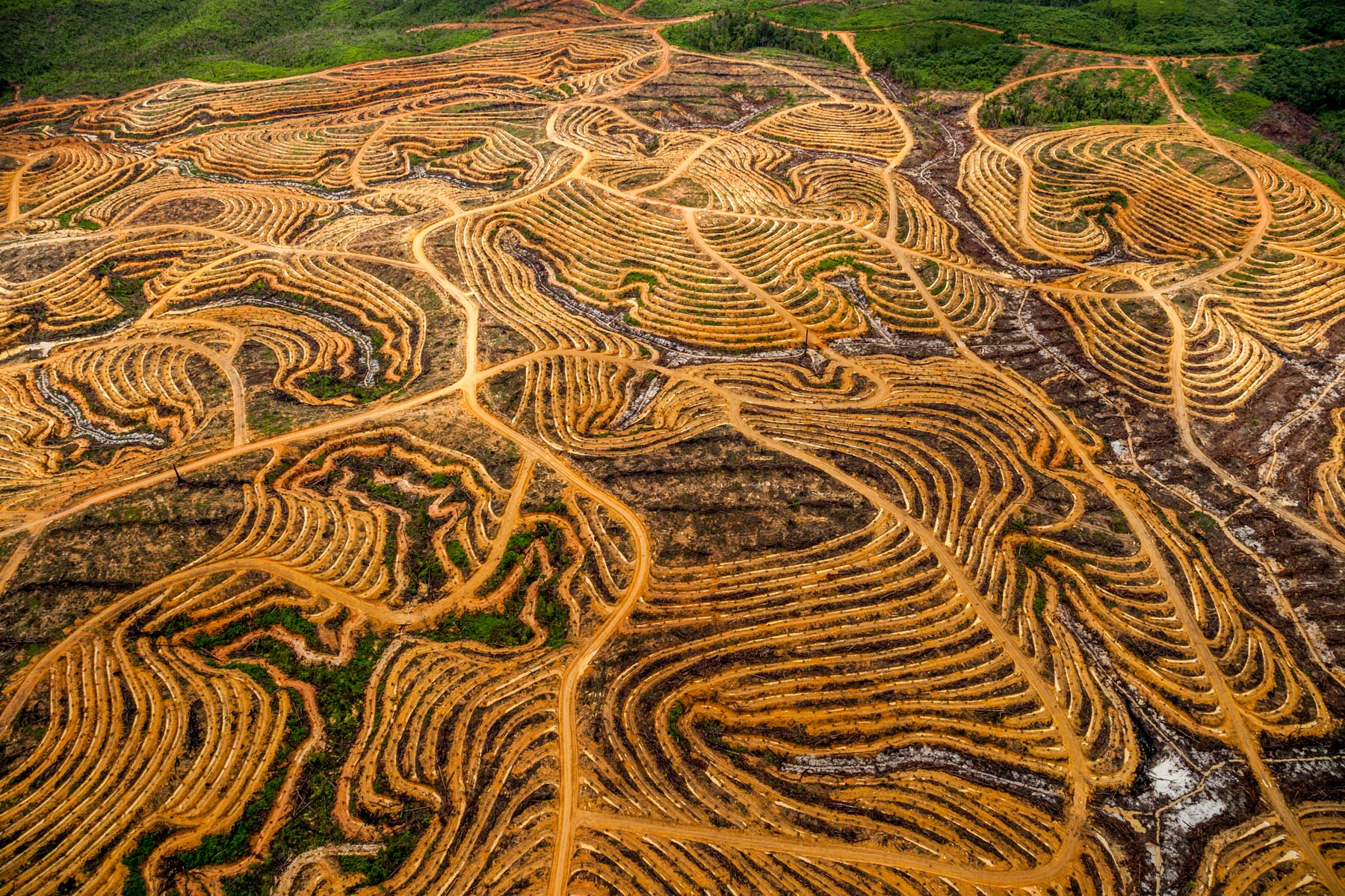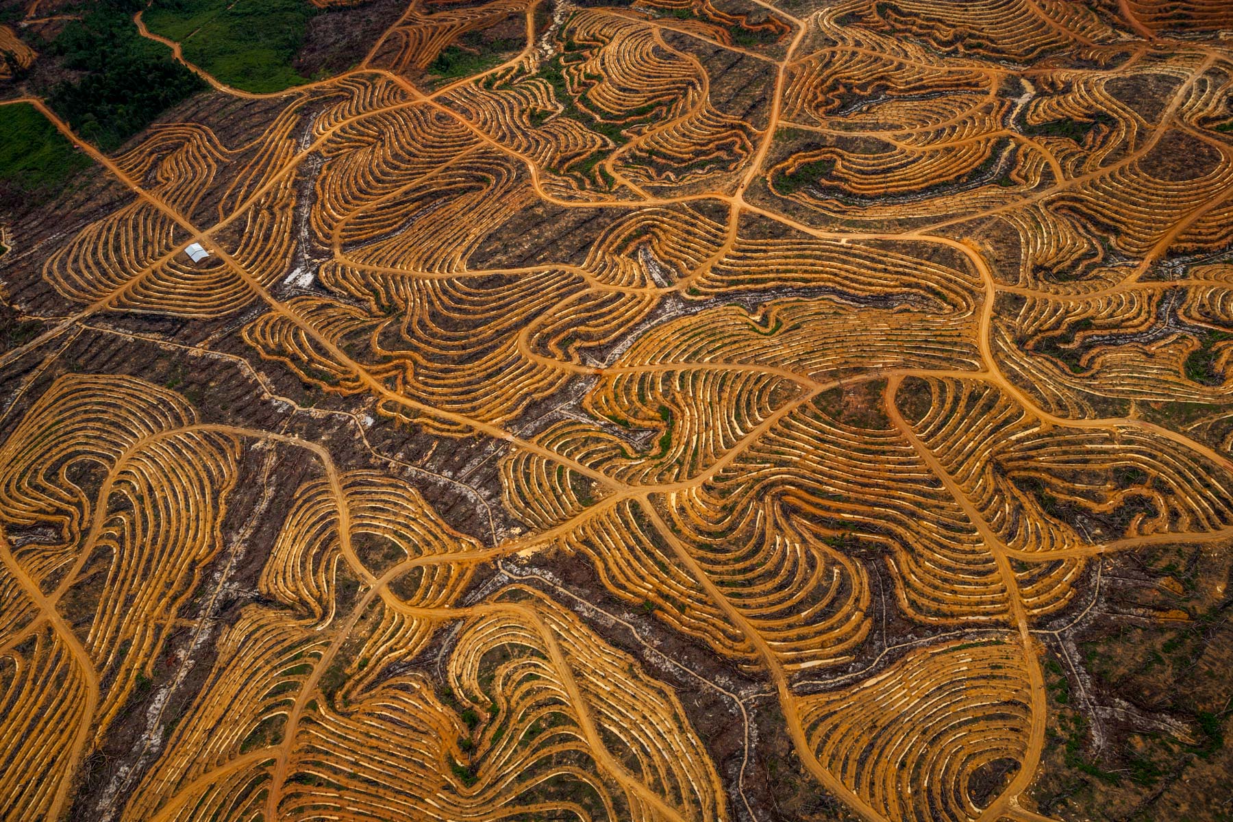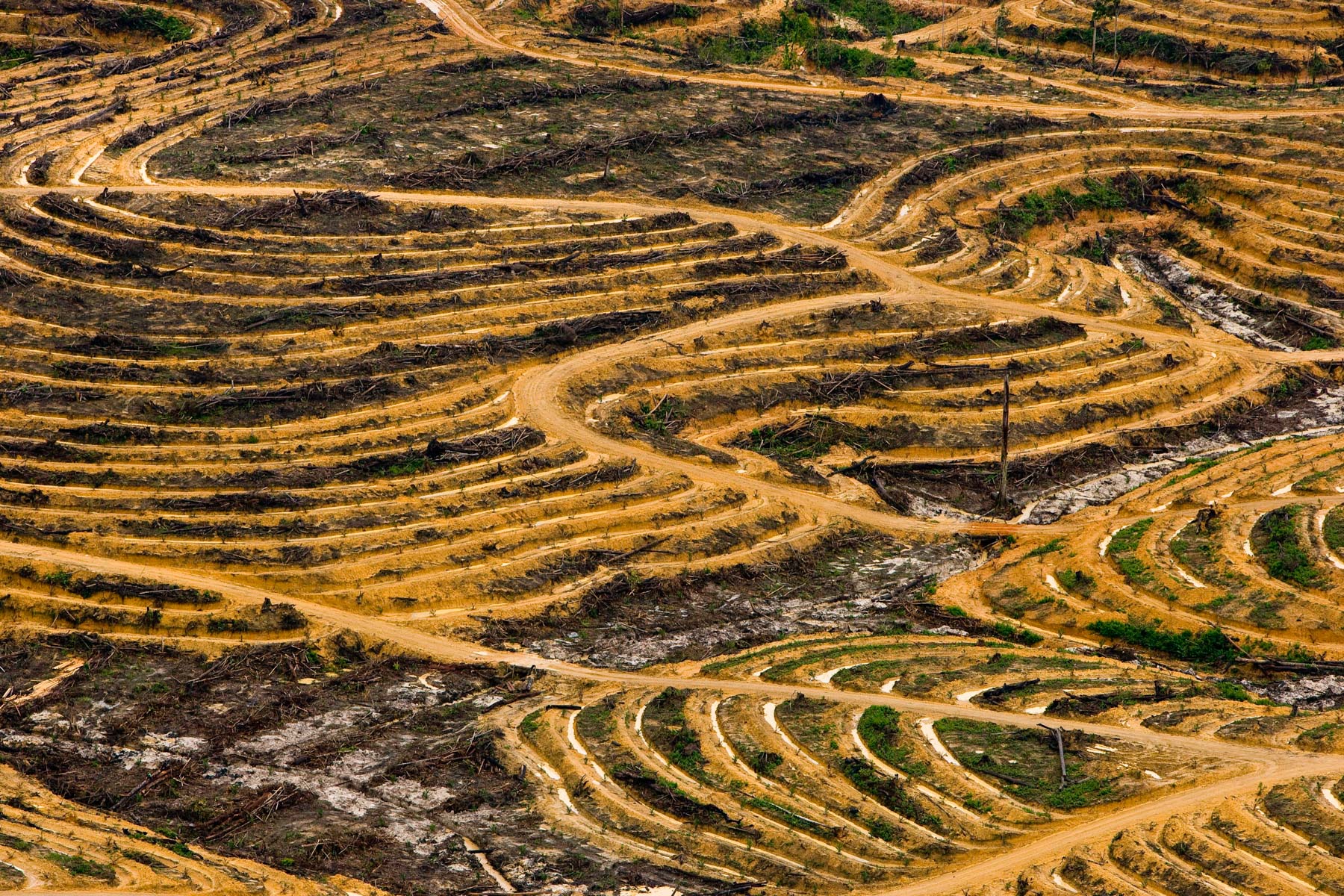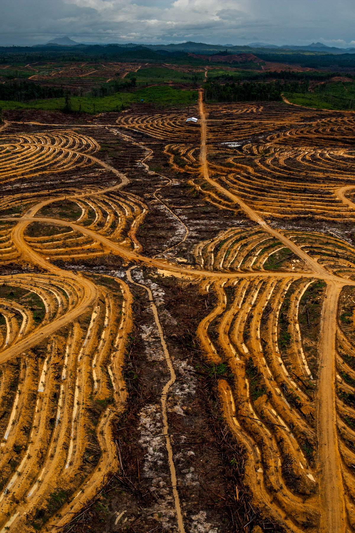 Nouvelle plantation de palmiers à huile près de Pundu, Bornéo, Indonésie (1°59’ S – 113°06’ E). Sur l’île de Bornéo, les palmiers à huile remplacent les forêts tropicales vierges à un rythme croissant, et ces plantations entraînent la perte de 80 % de la flore d’origine et de 80 à 90 % des espèces animales, comme l’orang-outan. La demande mondiale pour l’huile de palme est la principale cause de déforestation dans certaines parties de l’Asie. Au début de l’année 2010, il y avait 7,9 millions d’hectares plantés contre 600 000 en 1985, ainsi que 1,9 million d’hectares en attente de plantation. L’archipel indonésien est devenu le premier producteur mondial d’huile de palme en 2008, devant la Malaisie. La demande mondiale pour cette matière première augmente, passant de 14,5 millions de tonnes en 1990 à 56 millions de tonnes en 2013 car elle entre dans la composition de beaucoup de produits alimentaires, mais aussi dans celle des détergents et des cosmétiques. De plus en plus utilisée pour la fabrication d’agrocarburants, cette huile alimentaire pourrait devenir trop chère pour les consommateurs pauvres des pays en voie de développement. Dans l’Union européenne, l’utilisation de la moitié de la production d’huile de colza pour produire des agrocarburants contraint les pays membres à importer davantage d’huile de palme et de soja pour la consommation humaine.
