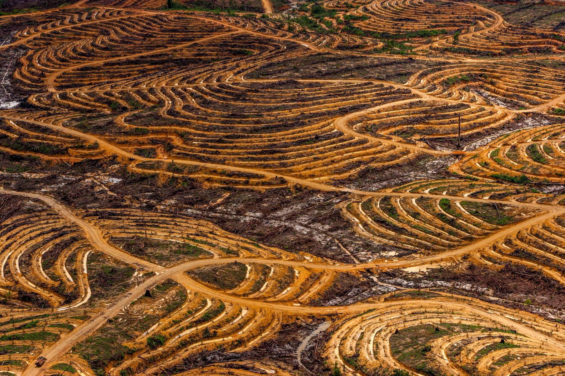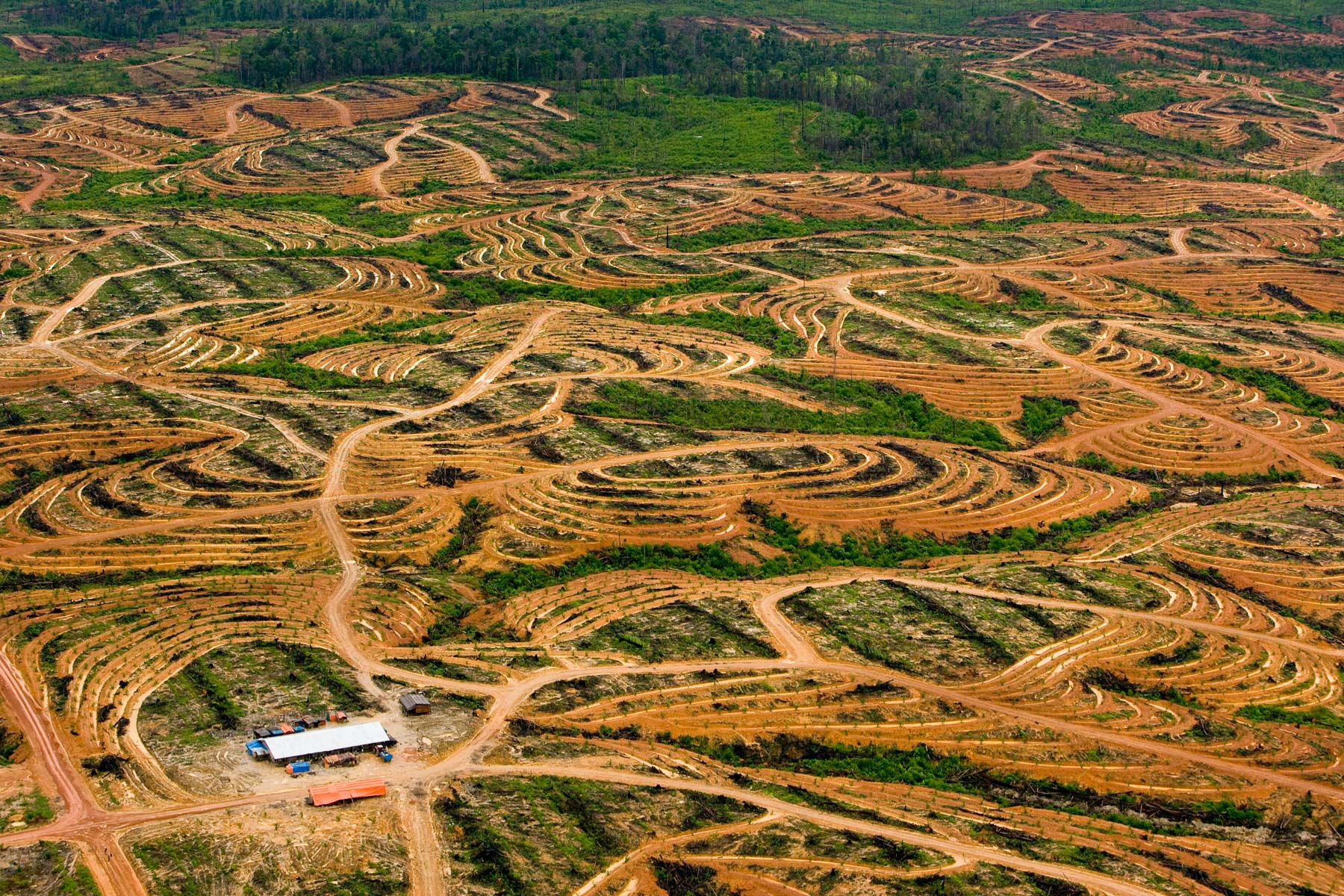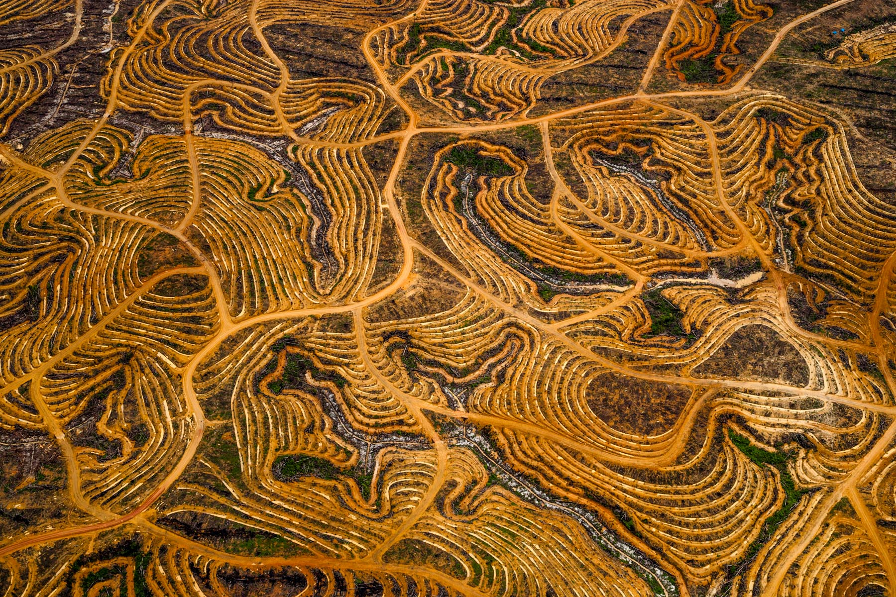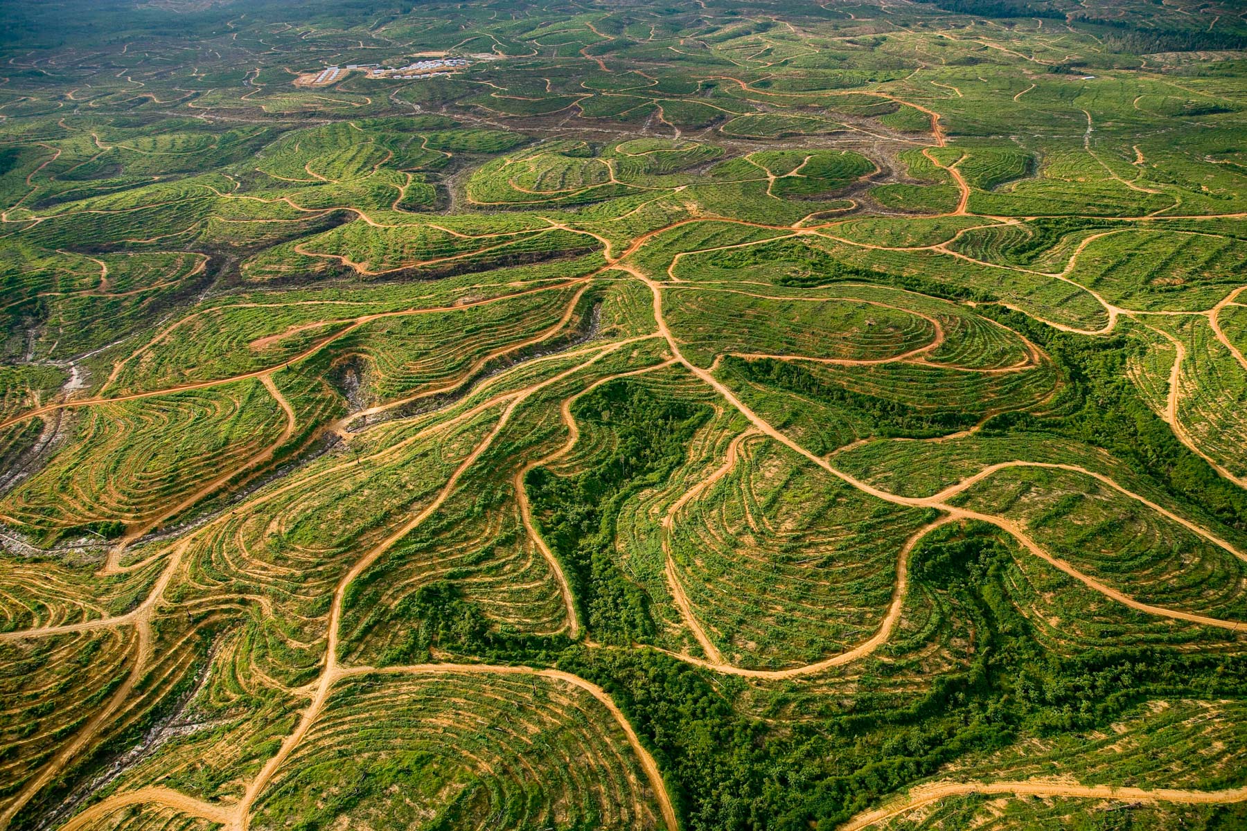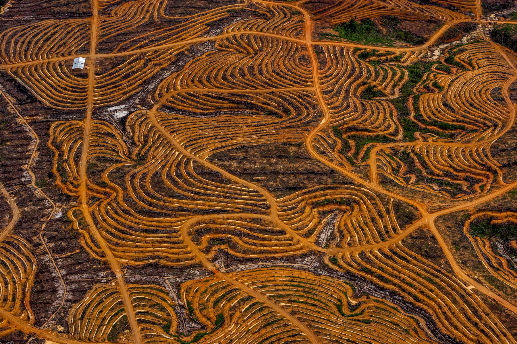 Nouvelle plantation de palmiers à huile près de Pundu, Bornéo, Indonésie (1°59’ S – 113°06’ E). Sur l’île de Bornéo, les palmiers à huile remplacent les forêts tropicales vierges à un rythme croissant, et ces plantations entraînent la perte de 80 % de la flore d’origine et de 80 à 90 % des espèces animales, comme l’orang-outan. La demande mondiale pour l’huile de palme est la principale cause de déforestation dans certaines parties de l’Asie. Au début de l’année 2010, il y avait 7,9 millions d’hectares plantés contre 600 000 en 1985, ainsi que 1,9 million d’hectares en attente de plantation. L’archipel indonésien est devenu le premier producteur mondial d’huile de palme en 2008, devant la Malaisie. La demande mondiale pour cette matière première augmente, passant de 14,5 millions de tonnes en 1990 à 56 millions de tonnes en 2013 car elle entre dans la composition de beaucoup de produits alimentaires, mais aussi dans celle des détergents et des cosmétiques. De plus en plus utilisée pour la fabrication d’agrocarburants, cette huile alimentaire pourrait devenir trop chère pour les consommateurs pauvres des pays en voie de développement. Dans l’Union européenne, l’utilisation de la moitié de la production d’huile de colza pour produire des agrocarburants contraint les pays membres à importer davantage d’huile de palme et de soja pour la consommation humaine.
