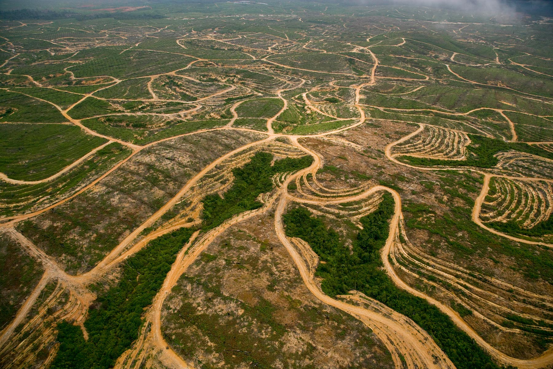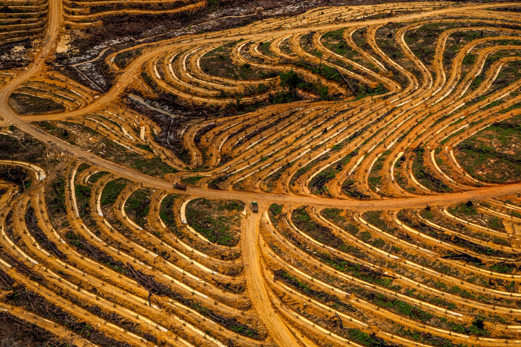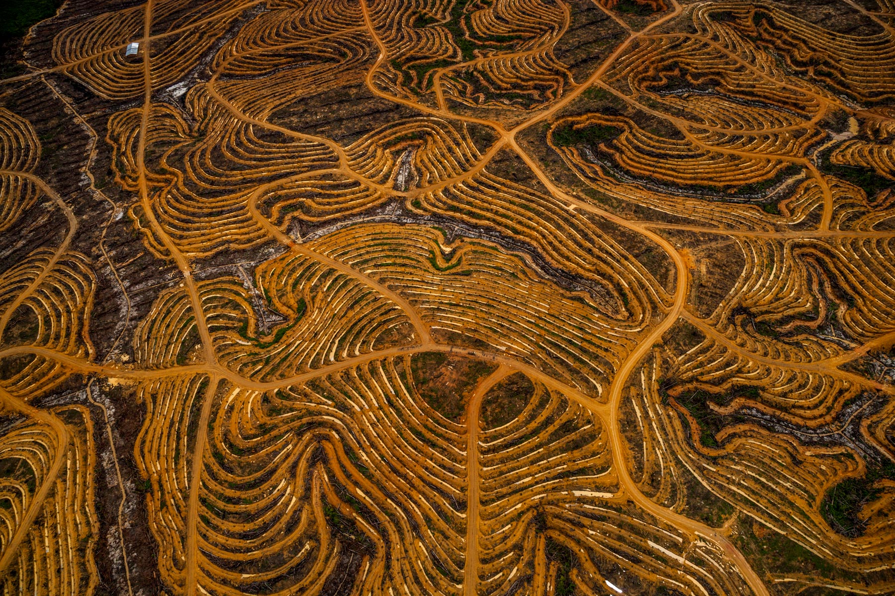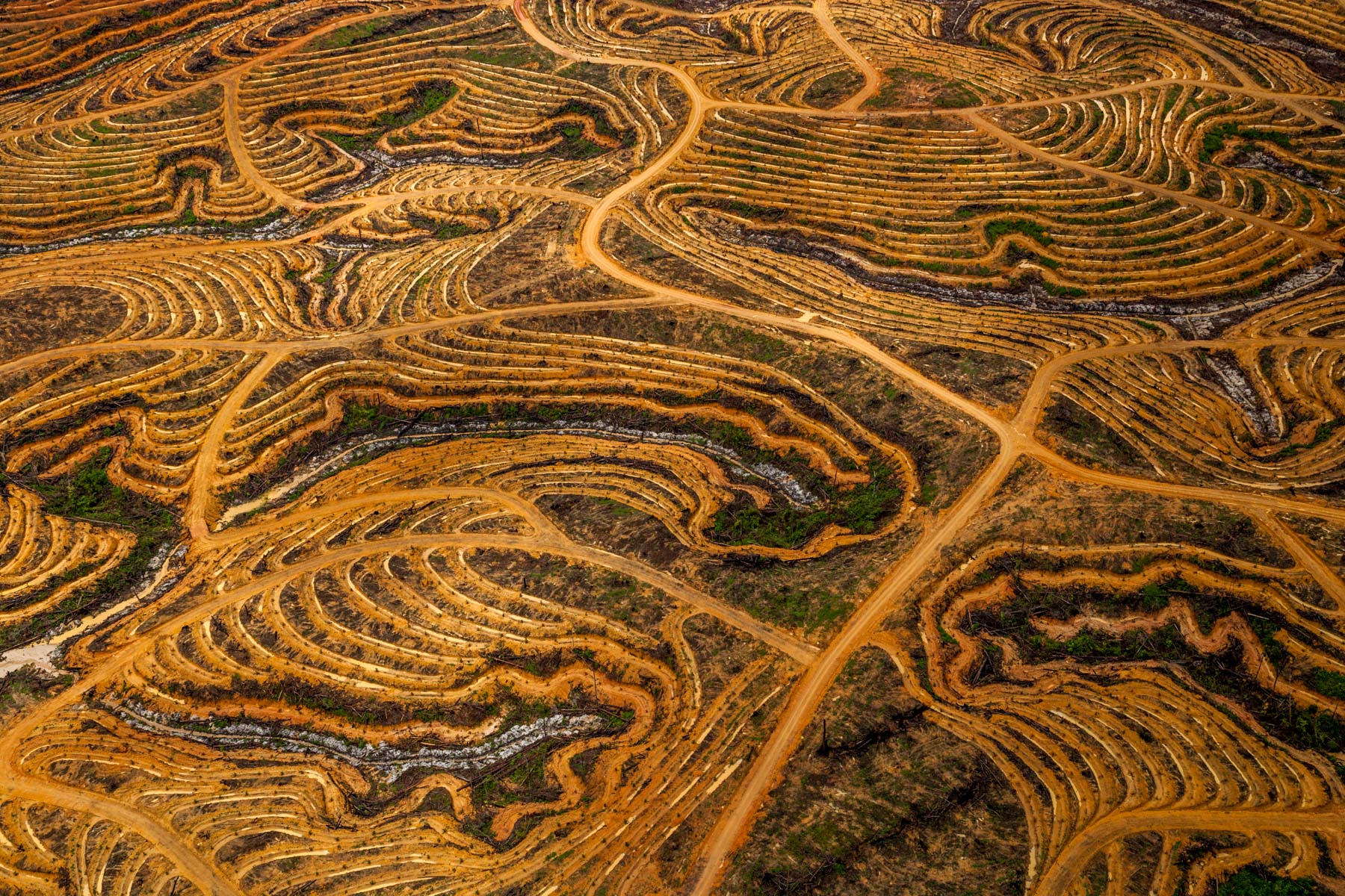 Nouvelle plantation de palmiers à huile près de Pundu, Bornéo, Indonésie (1°59’ S – 113°06’ E). Sur l’île de Bornéo, les palmiers à huile remplacent les forêts tropicales vierges à un rythme croissant, et ces plantations entraînent la perte de 80 % de la flore d’origine et de 80 à 90 % des espèces animales, comme l’orang-outan. La demande mondiale pour l’huile de palme est la principale cause de déforestation dans certaines parties de l’Asie. Au début de l’année 2010, il y avait 7,9 millions d’hectares plantés contre 600 000 en 1985, ainsi que 1,9 million d’hectares en attente de plantation. L’archipel indonésien est devenu le premier producteur mondial d’huile de palme en 2008, devant la Malaisie. La demande mondiale pour cette matière première augmente, passant de 14,5 millions de tonnes en 1990 à 56 millions de tonnes en 2013 car elle entre dans la composition de beaucoup de produits alimentaires, mais aussi dans celle des détergents et des cosmétiques. De plus en plus utilisée pour la fabrication d’agrocarburants, cette huile alimentaire pourrait devenir trop chère pour les consommateurs pauvres des pays en voie de développement. Dans l’Union européenne, l’utilisation de la moitié de la production d’huile de colza pour produire des agrocarburants contraint les pays membres à importer davantage d’huile de palme et de soja pour la consommation humaine.