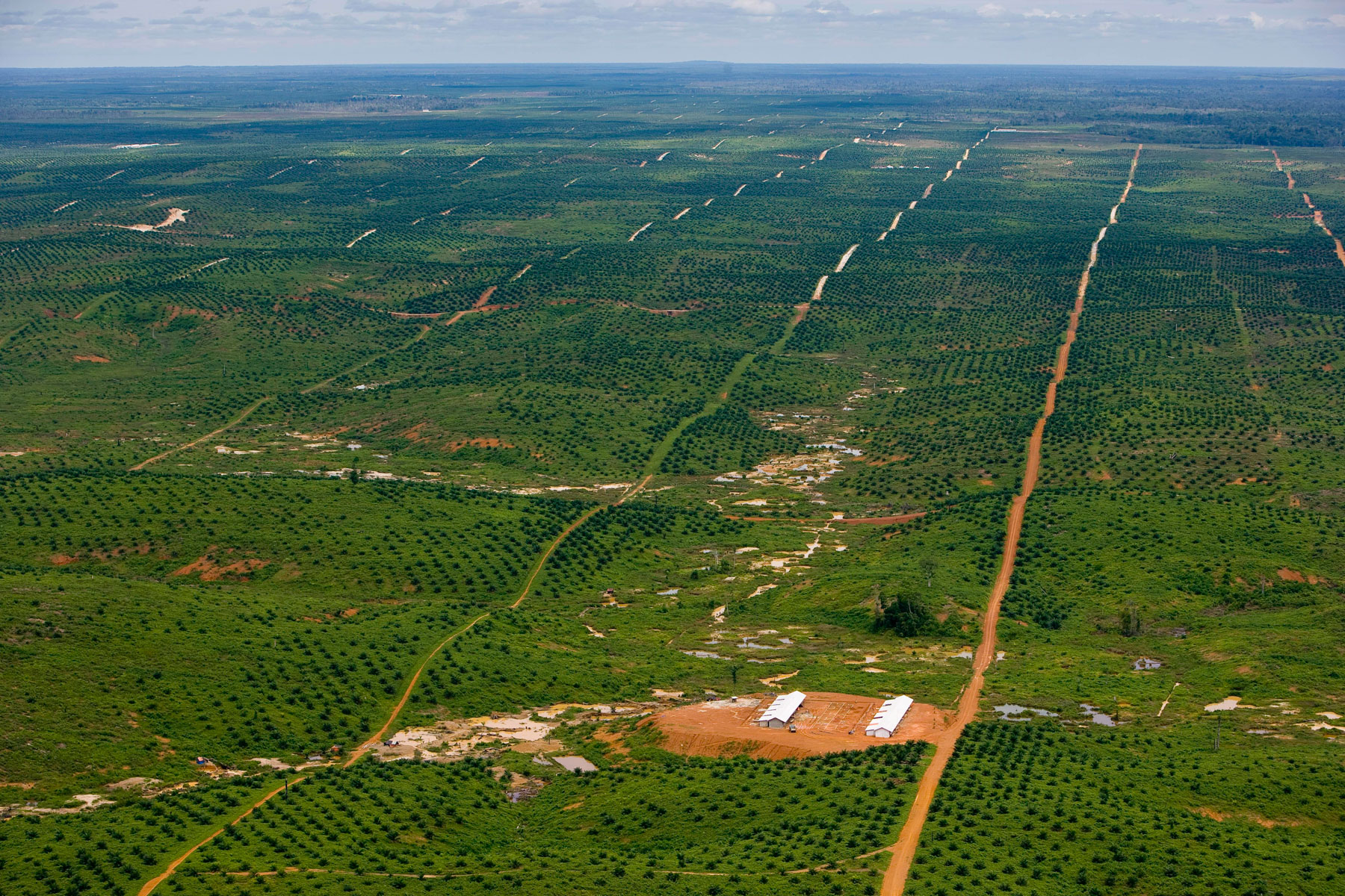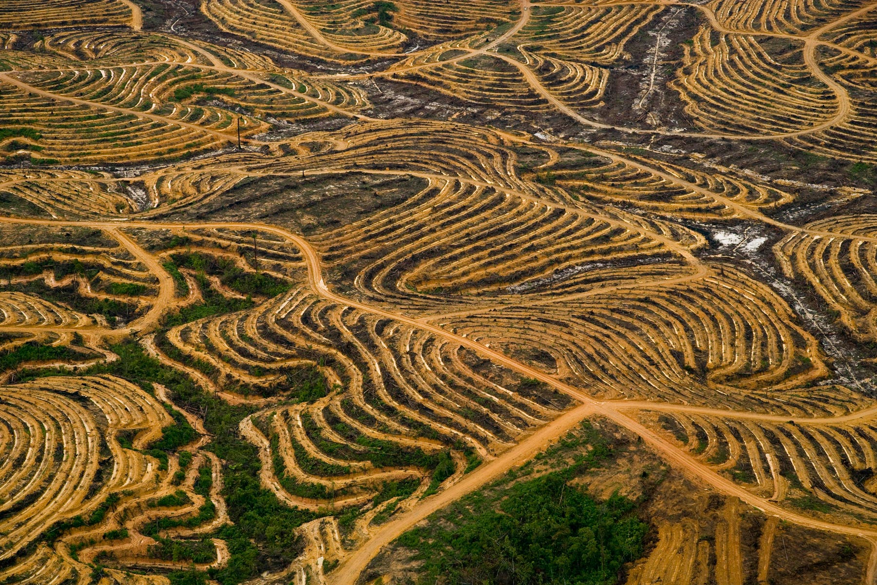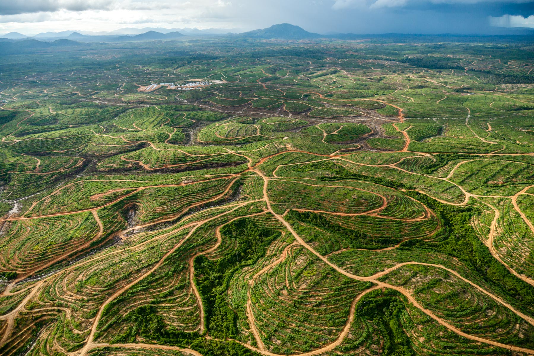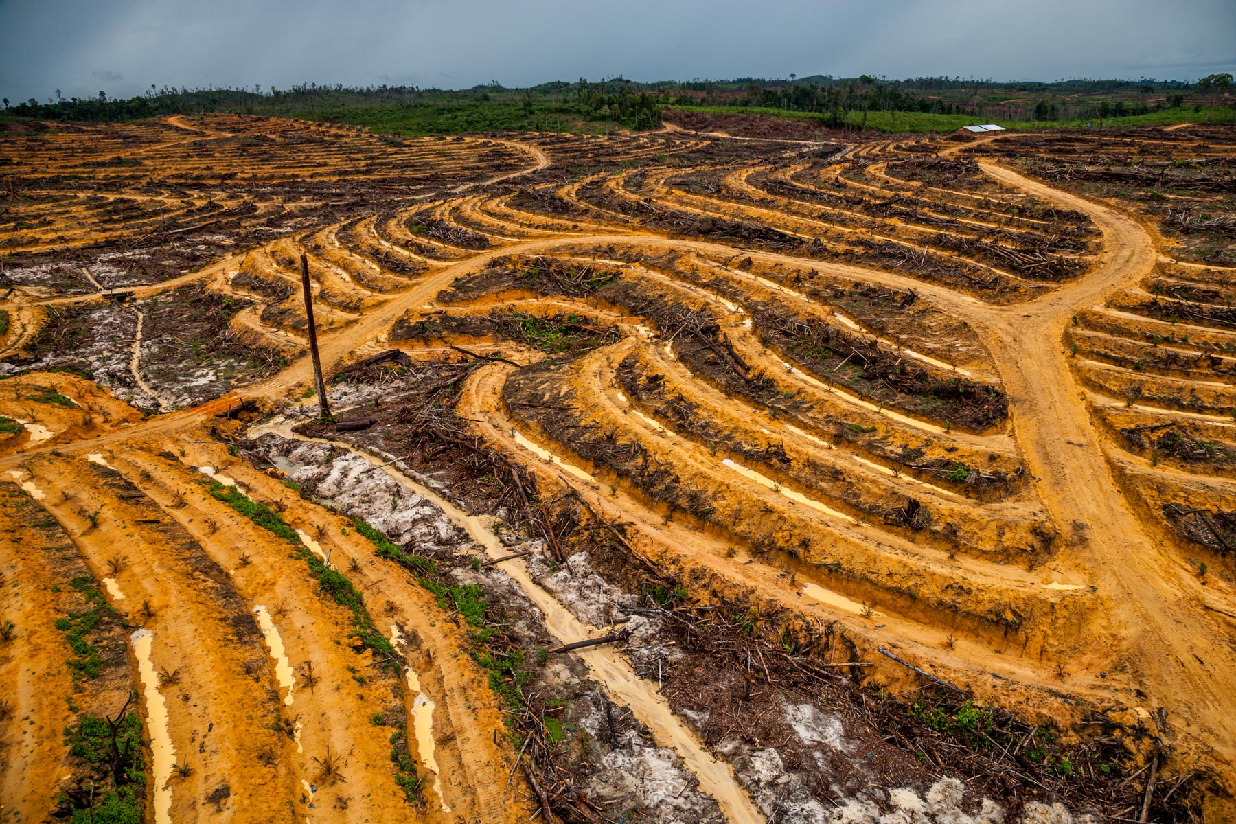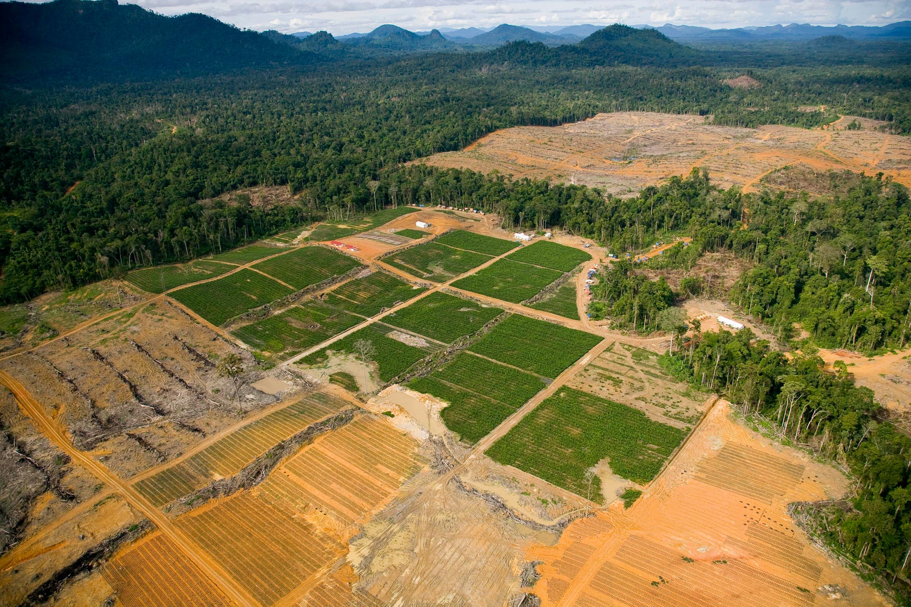 Nouvelle plantation de palmiers à huile près de Pundu, Bornéo, Indonésie (1°59’ S – 113°06’ E). Sur l’île de Bornéo, les palmiers à huile remplacent les forêts tropicales vierges à un rythme croissant, et ces plantations entraînent la perte de 80 % de la flore d’origine et de 80 à 90 % des espèces animales, comme l’orang-outan. La demande mondiale pour l’huile de palme est la principale cause de déforestation dans certaines parties de l’Asie. Au début de l’année 2010, il y avait 7,9 millions d’hectares plantés contre 600 000 en 1985, ainsi que 1,9 million d’hectares en attente de plantation. L’archipel indonésien est devenu le premier producteur mondial d’huile de palme en 2008, devant la Malaisie. La demande mondiale pour cette matière première augmente, passant de 14,5 millions de tonnes en 1990 à 56 millions de tonnes en 2013 car elle entre dans la composition de beaucoup de produits alimentaires, mais aussi dans celle des détergents et des cosmétiques. De plus en plus utilisée pour la fabrication d’agrocarburants, cette huile alimentaire pourrait devenir trop chère pour les consommateurs pauvres des pays en voie de développement. Dans l’Union européenne, l’utilisation de la moitié de la production d’huile de colza pour produire des agrocarburants contraint les pays membres à importer davantage d’huile de palme et de soja pour la consommation humaine.
