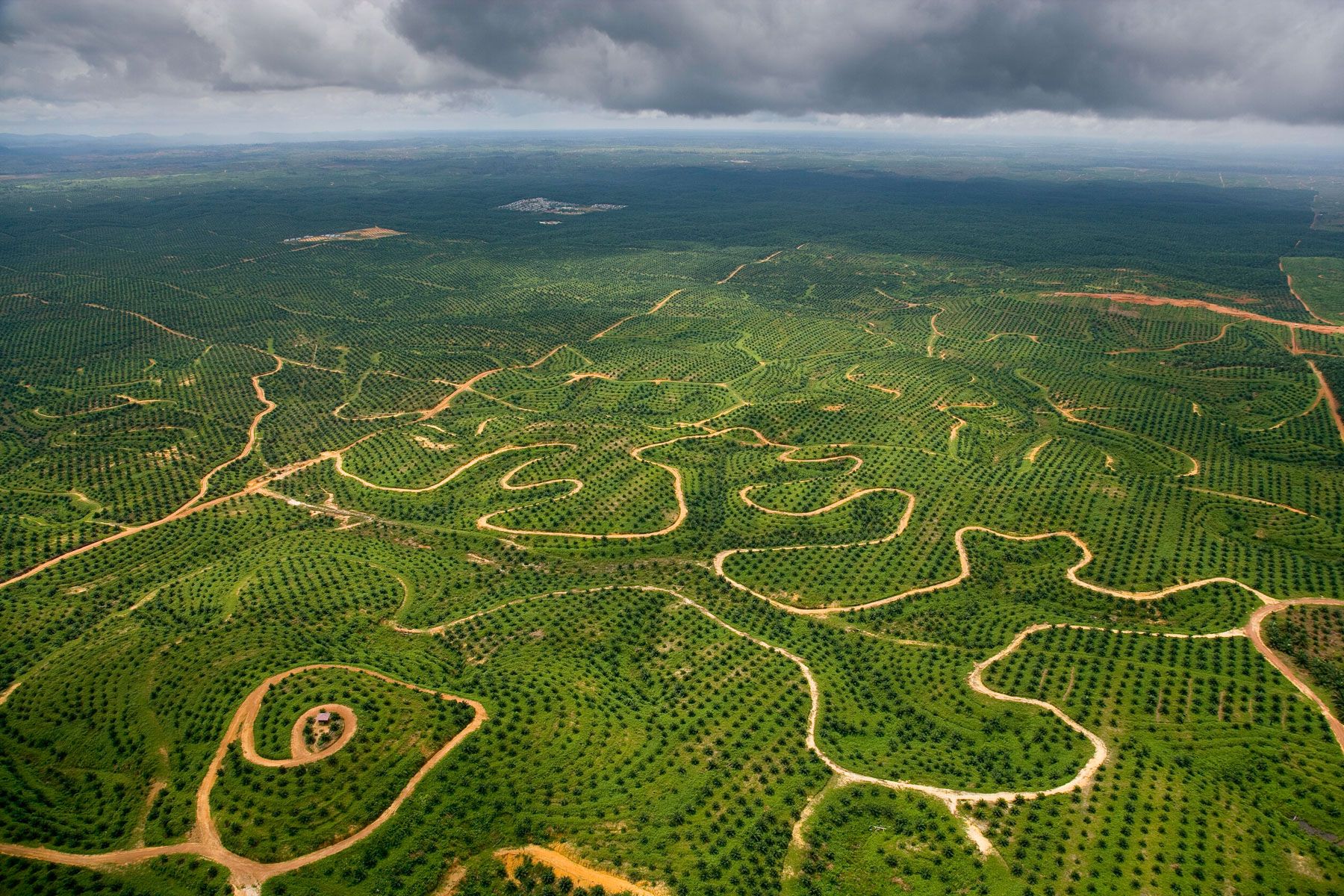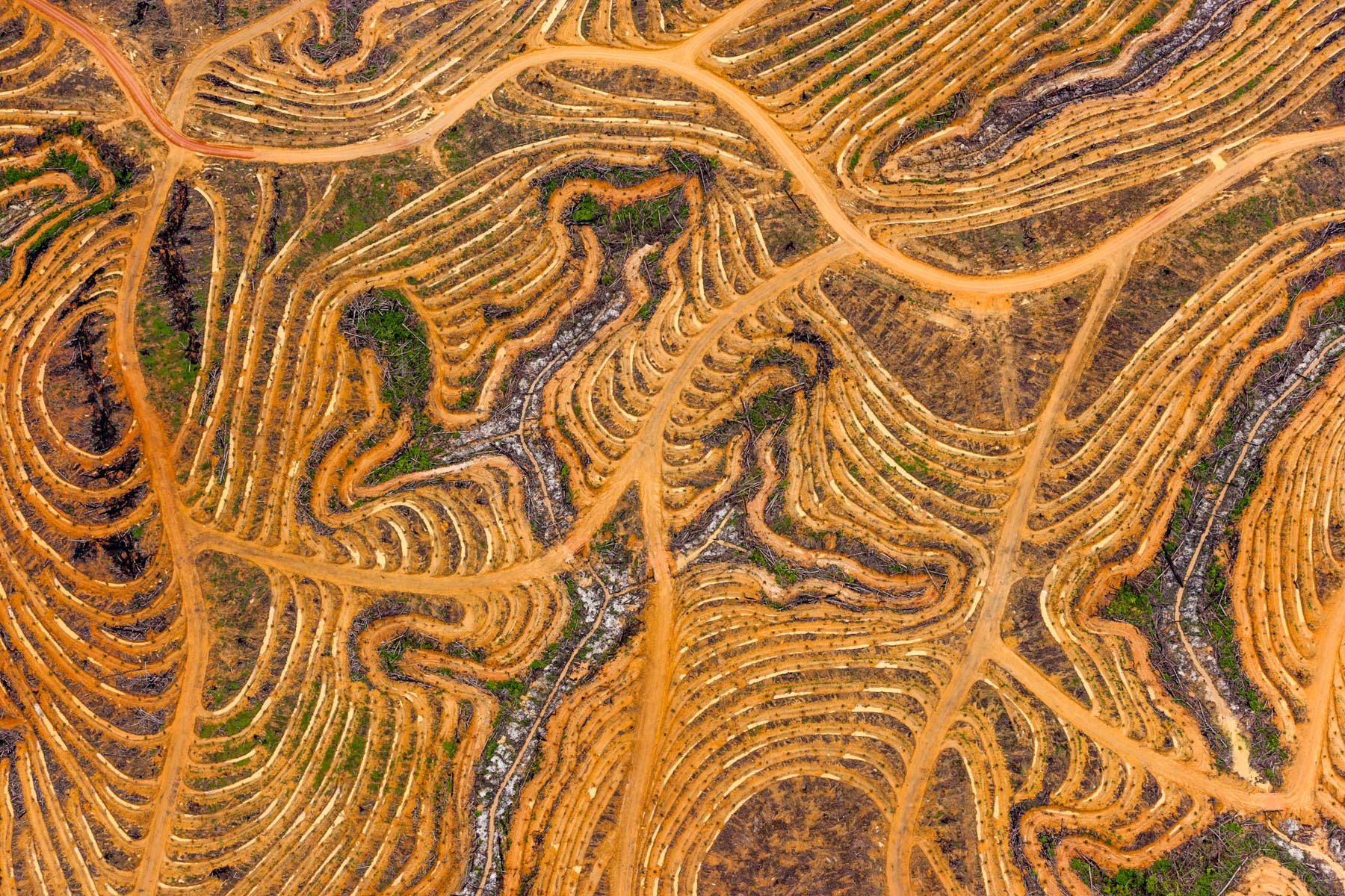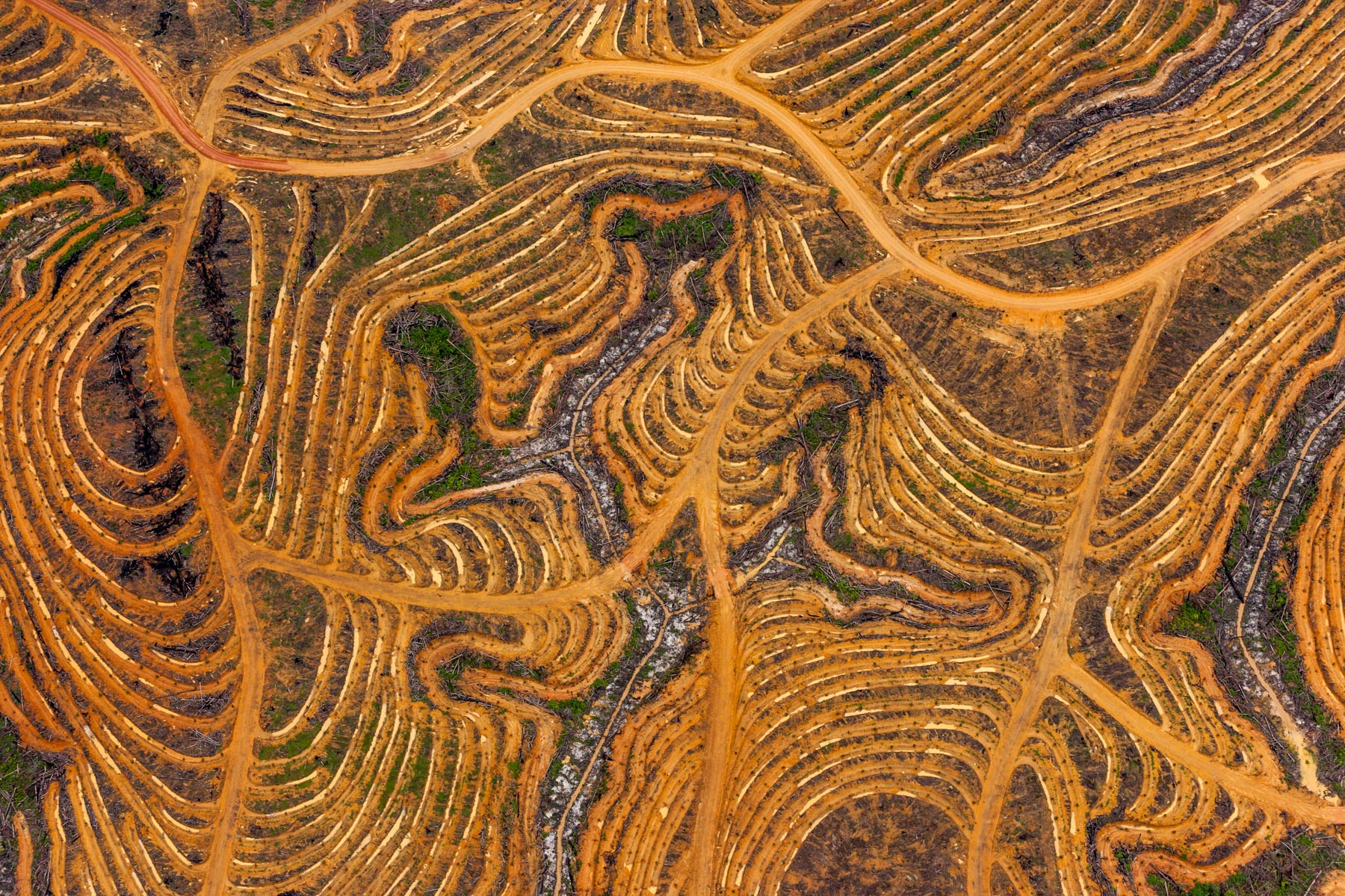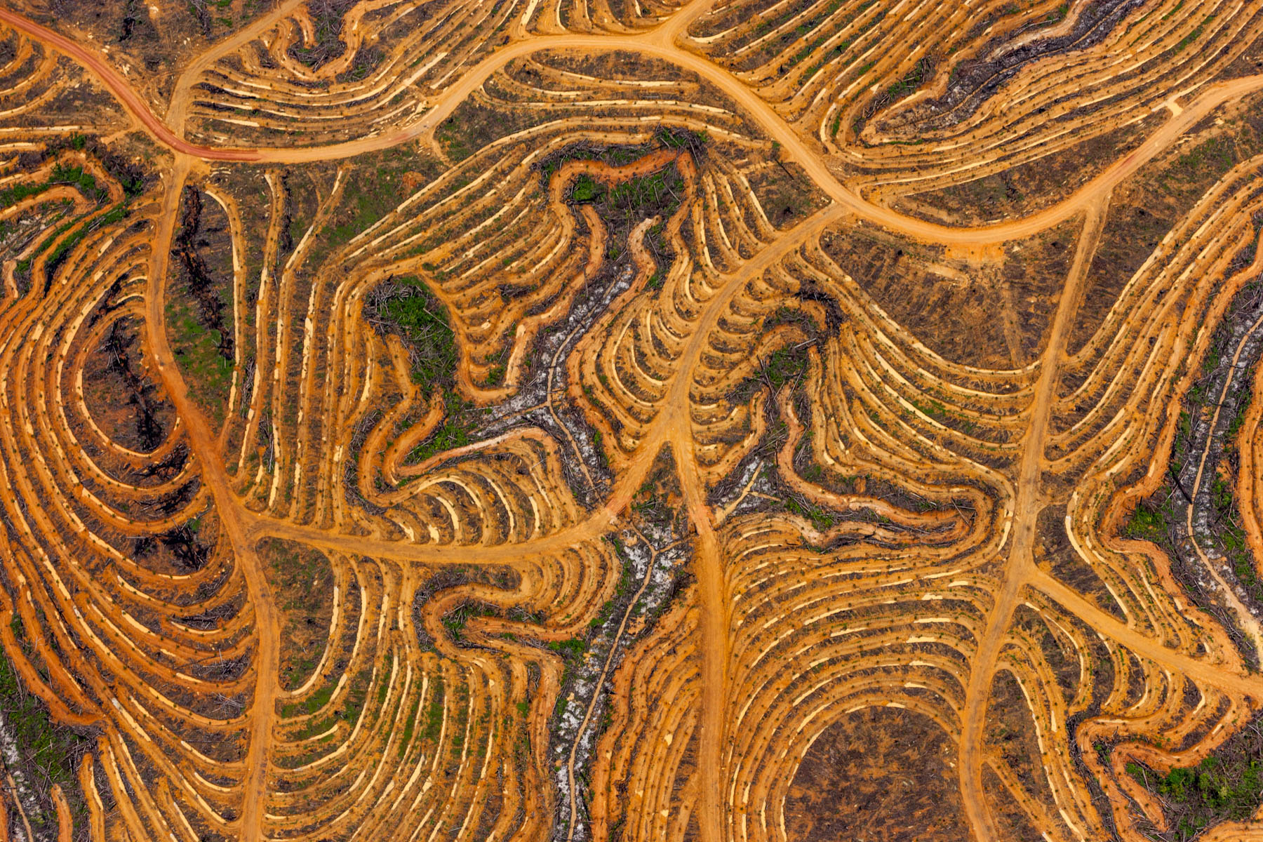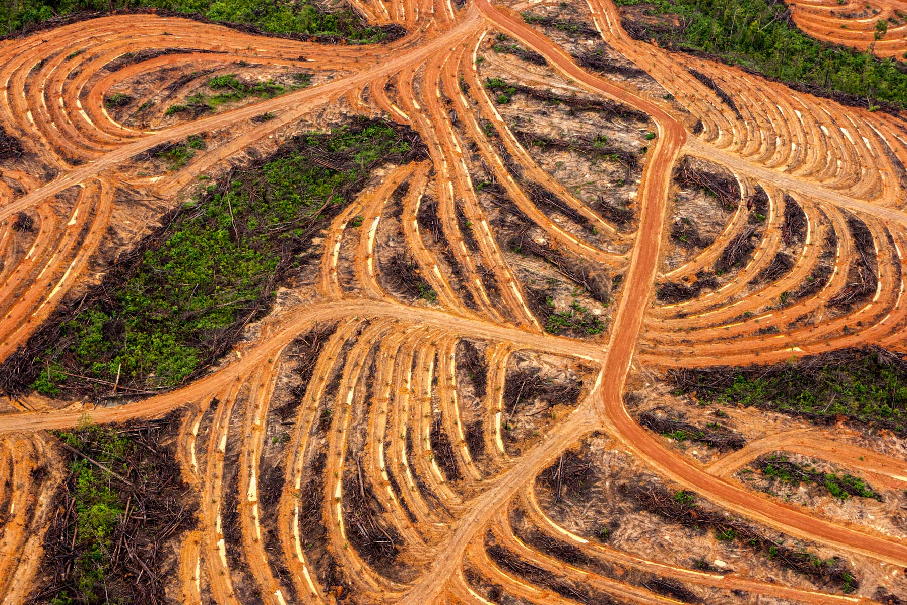 Nouvelle plantation de palmiers à huile près de Pundu, Bornéo, Indonésie (1°59’ S – 113°06’ E). Sur l’île de Bornéo, les palmiers à huile remplacent les forêts tropicales vierges à un rythme croissant, et ces plantations entraînent la perte de 80 % de la flore d’origine et de 80 à 90 % des espèces animales, comme l’orang-outan. La demande mondiale pour l’huile de palme est la principale cause de déforestation dans certaines parties de l’Asie. Au début de l’année 2010, il y avait 7,9 millions d’hectares plantés contre 600 000 en 1985, ainsi que 1,9 million d’hectares en attente de plantation. L’archipel indonésien est devenu le premier producteur mondial d’huile de palme en 2008, devant la Malaisie. La demande mondiale pour cette matière première augmente, passant de 14,5 millions de tonnes en 1990 à 56 millions de tonnes en 2013 car elle entre dans la composition de beaucoup de produits alimentaires, mais aussi dans celle des détergents et des cosmétiques. De plus en plus utilisée pour la fabrication d’agrocarburants, cette huile alimentaire pourrait devenir trop chère pour les consommateurs pauvres des pays en voie de développement. Dans l’Union européenne, l’utilisation de la moitié de la production d’huile de colza pour produire des agrocarburants contraint les pays membres à importer davantage d’huile de palme et de soja pour la consommation humaine.
