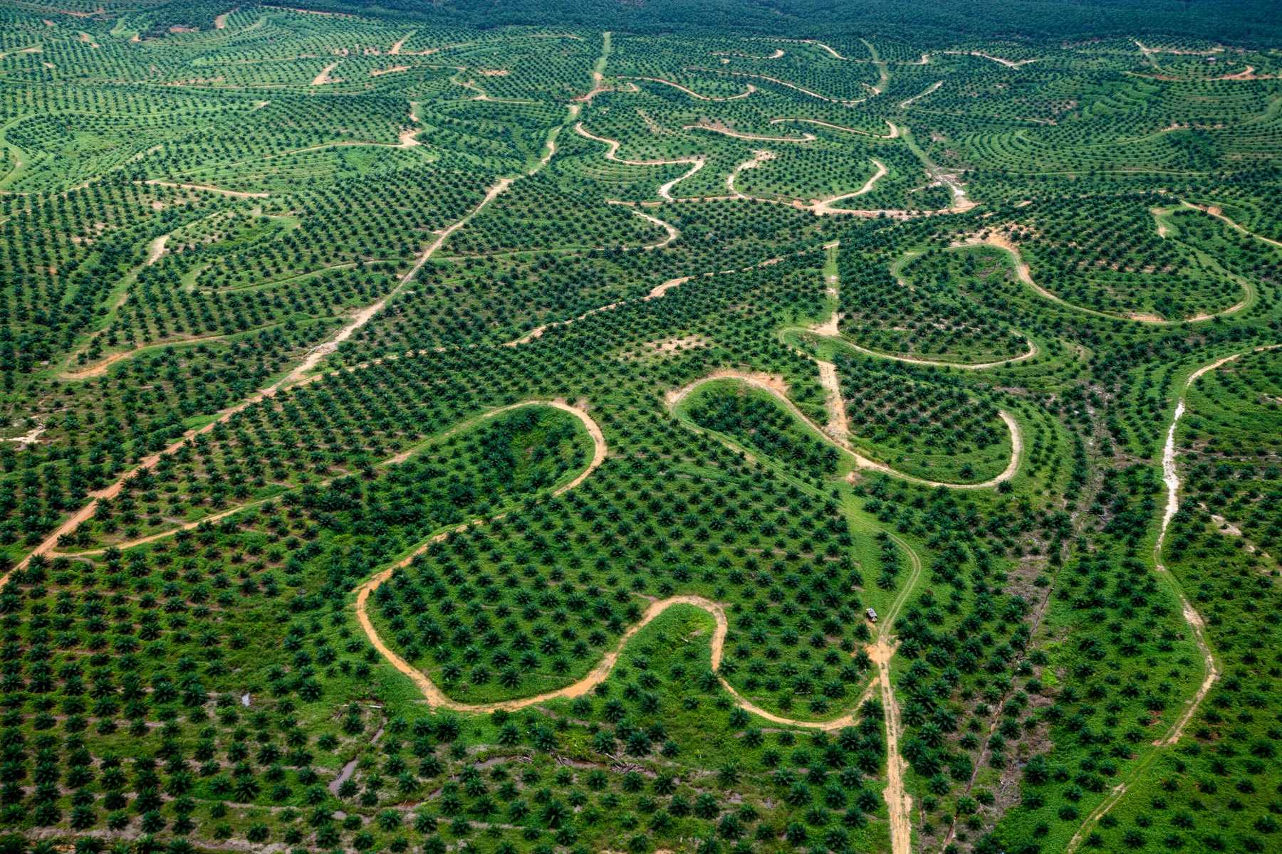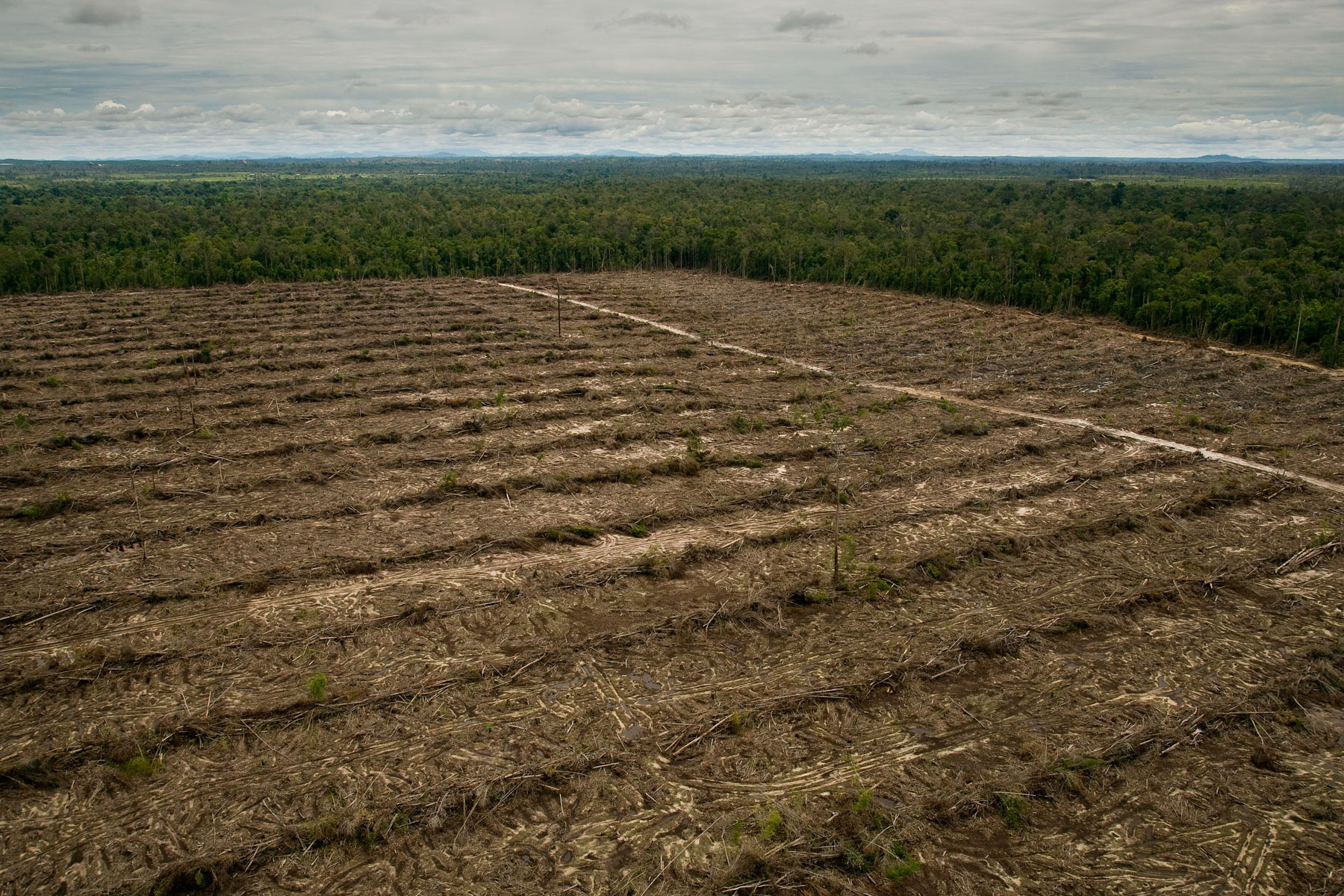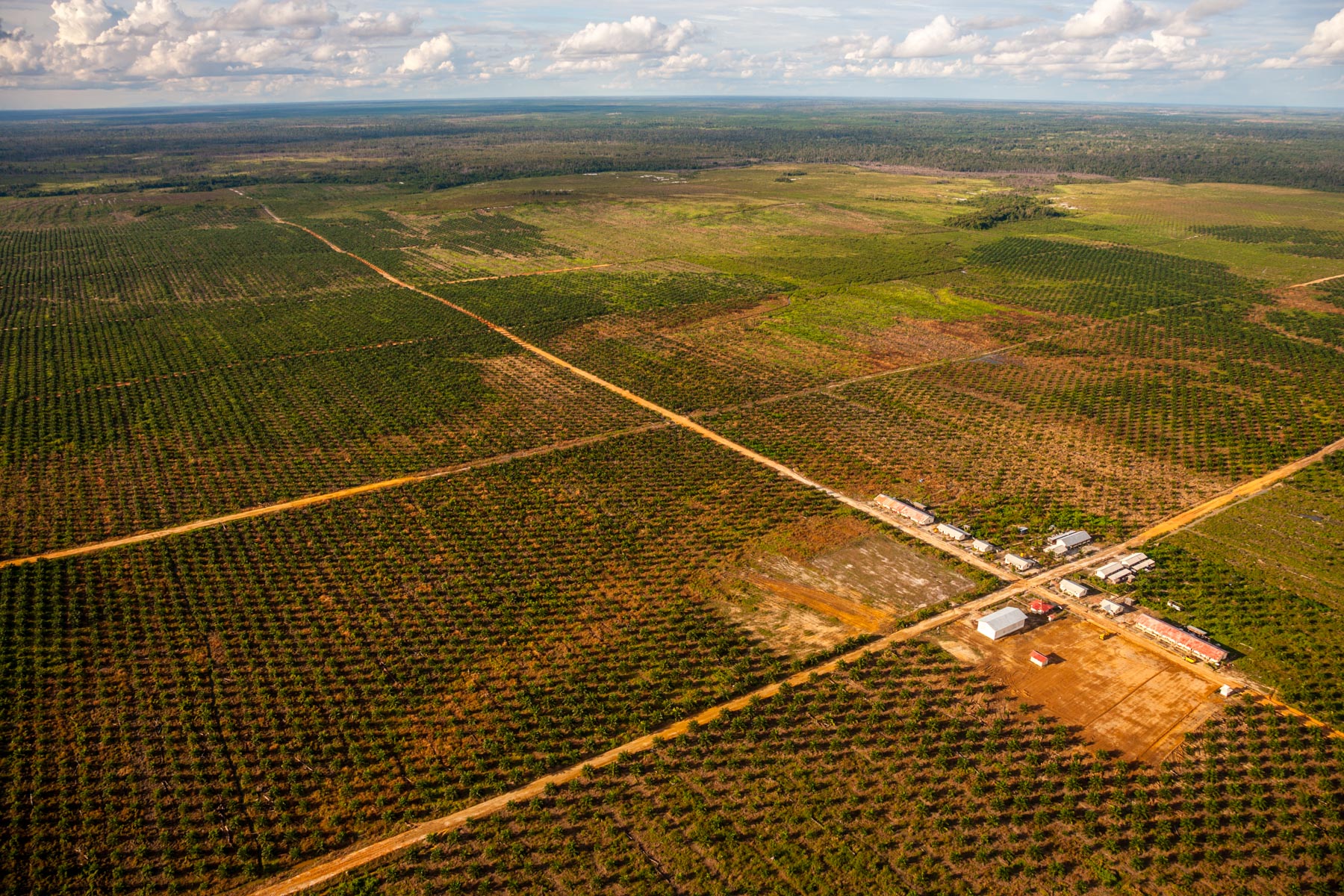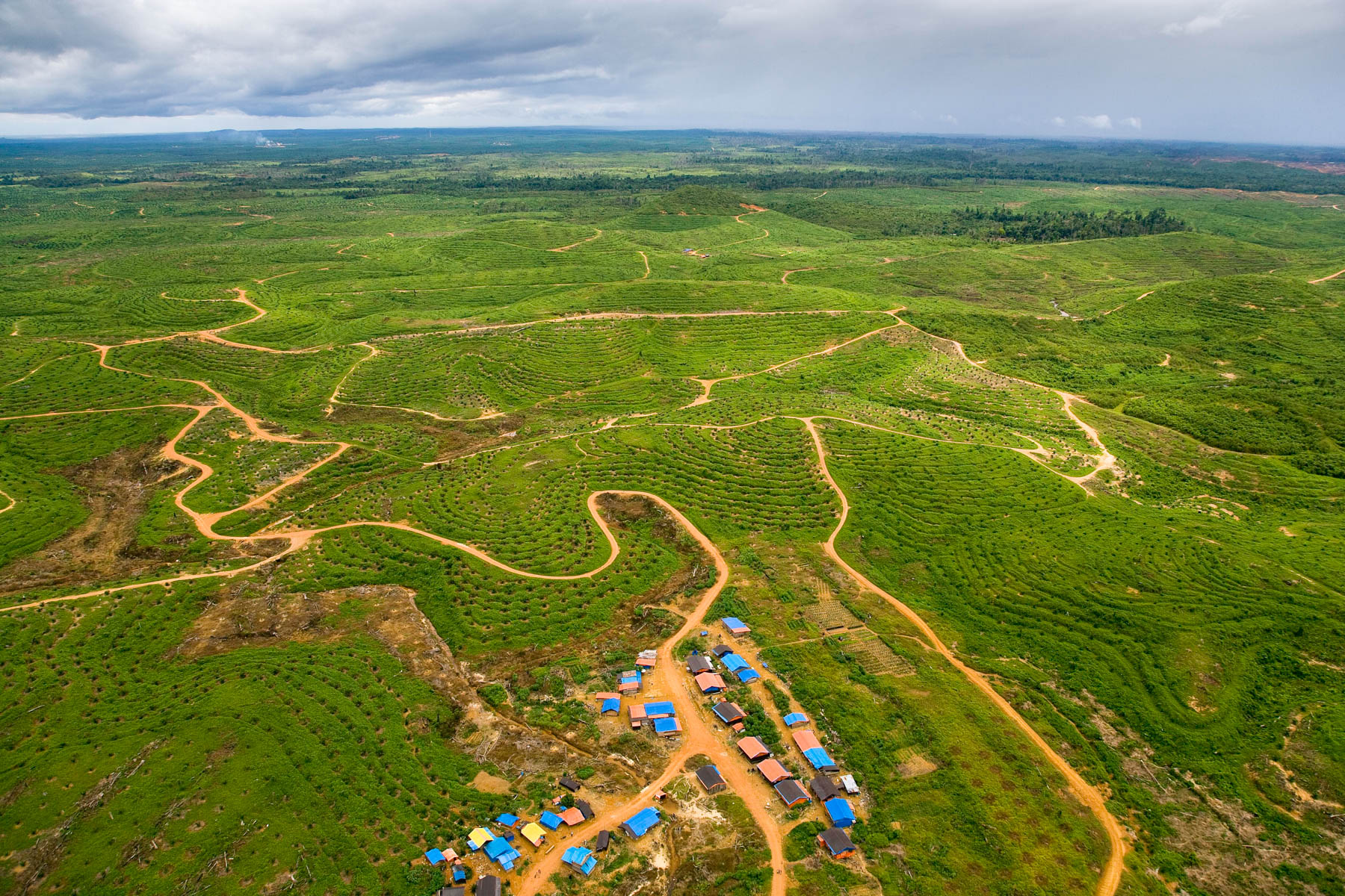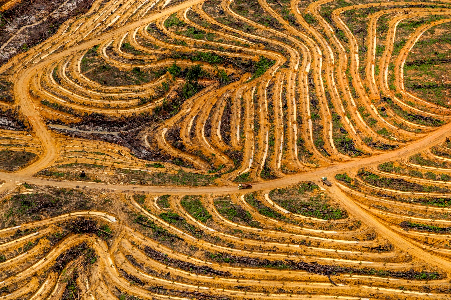 Nouvelle plantation de palmiers à huile près de Pundu, Bornéo, Indonésie (1°59’ S – 113°06’ E). Sur l’île de Bornéo, les palmiers à huile remplacent les forêts tropicales vierges à un rythme croissant, et ces plantations entraînent la perte de 80 % de la flore d’origine et de 80 à 90 % des espèces animales, comme l’orang-outan. La demande mondiale pour l’huile de palme est la principale cause de déforestation dans certaines parties de l’Asie. Au début de l’année 2010, il y avait 7,9 millions d’hectares plantés contre 600 000 en 1985, ainsi que 1,9 million d’hectares en attente de plantation. L’archipel indonésien est devenu le premier producteur mondial d’huile de palme en 2008, devant la Malaisie. La demande mondiale pour cette matière première augmente, passant de 14,5 millions de tonnes en 1990 à 56 millions de tonnes en 2013 car elle entre dans la composition de beaucoup de produits alimentaires, mais aussi dans celle des détergents et des cosmétiques. De plus en plus utilisée pour la fabrication d’agrocarburants, cette huile alimentaire pourrait devenir trop chère pour les consommateurs pauvres des pays en voie de développement. Dans l’Union européenne, l’utilisation de la moitié de la production d’huile de colza pour produire des agrocarburants contraint les pays membres à importer davantage d’huile de palme et de soja pour la consommation humaine.