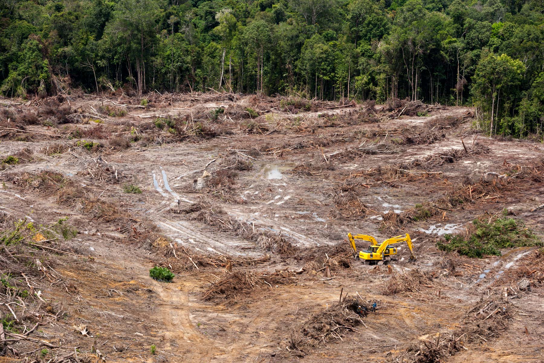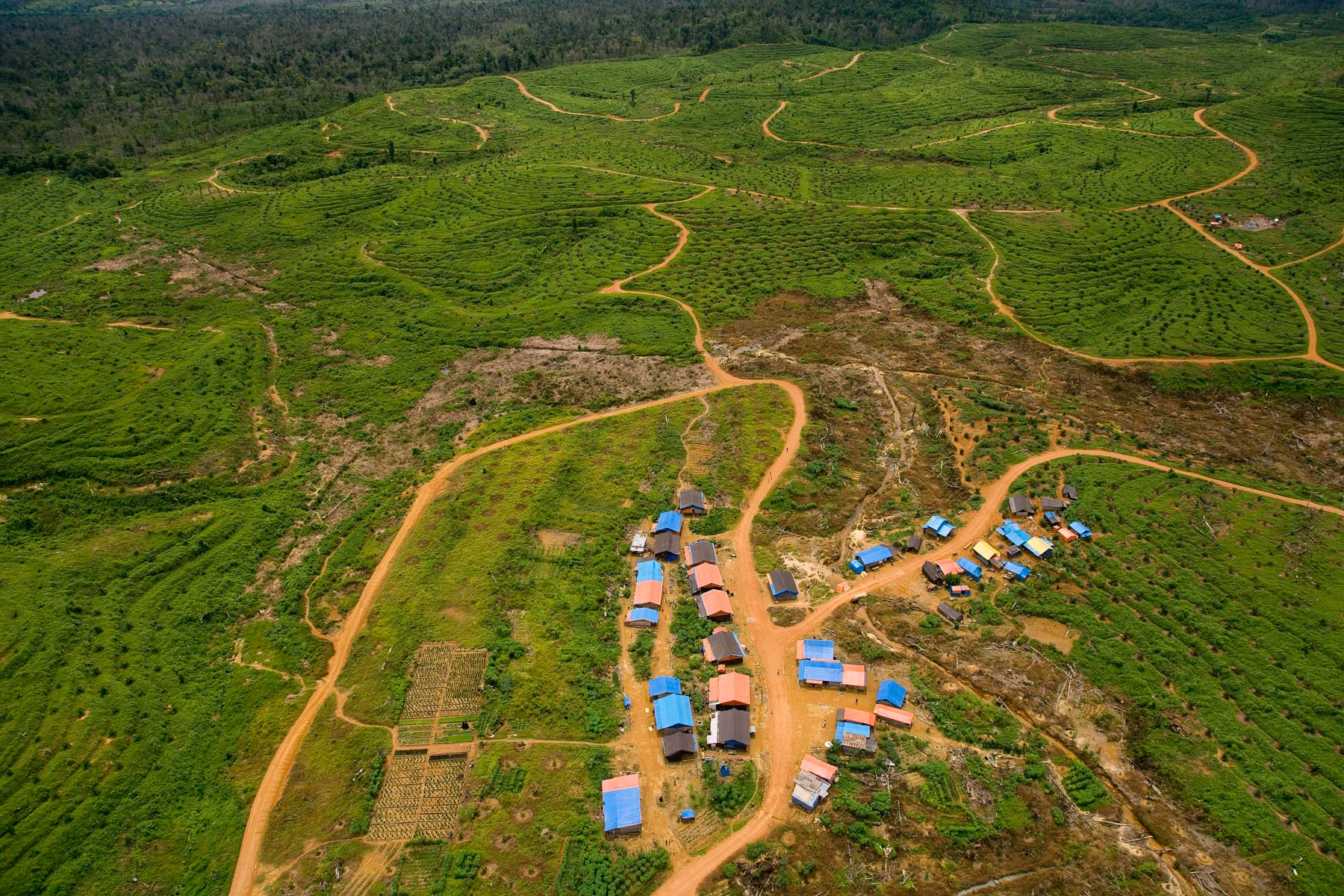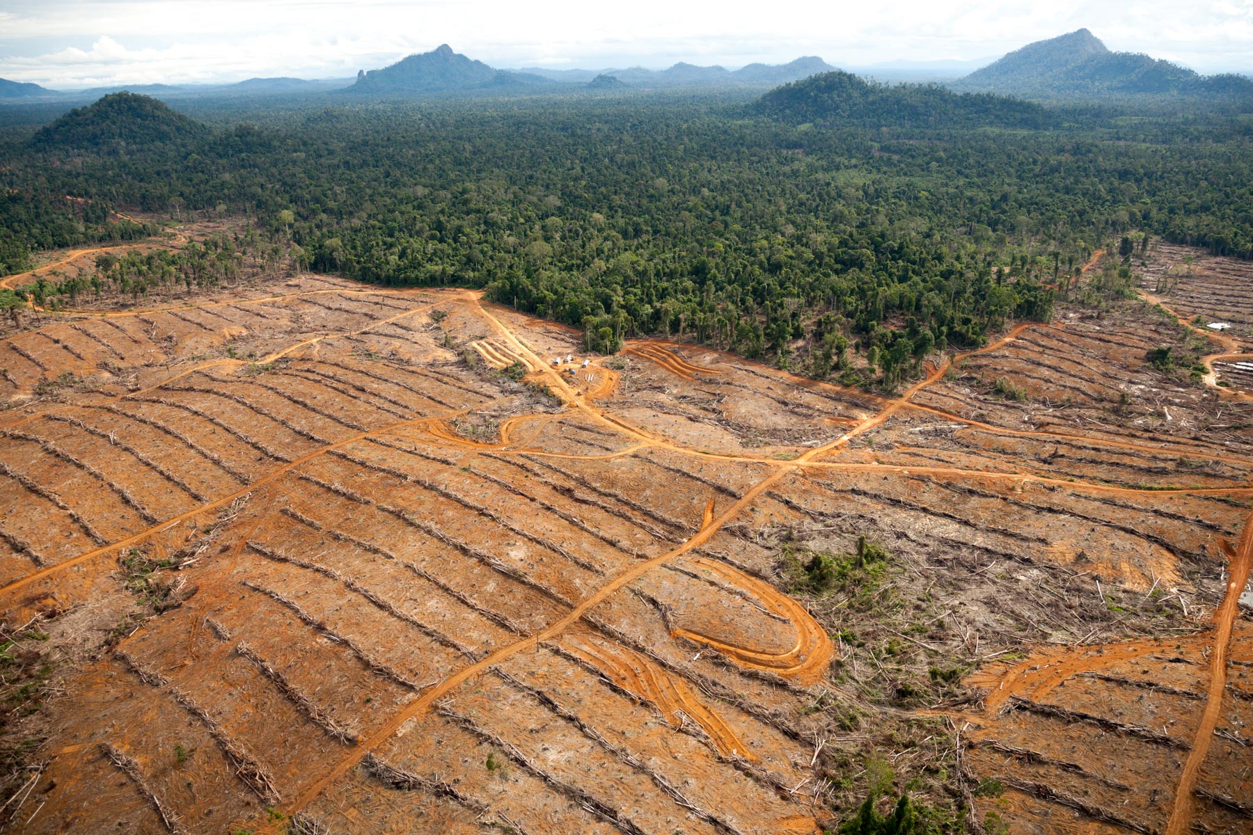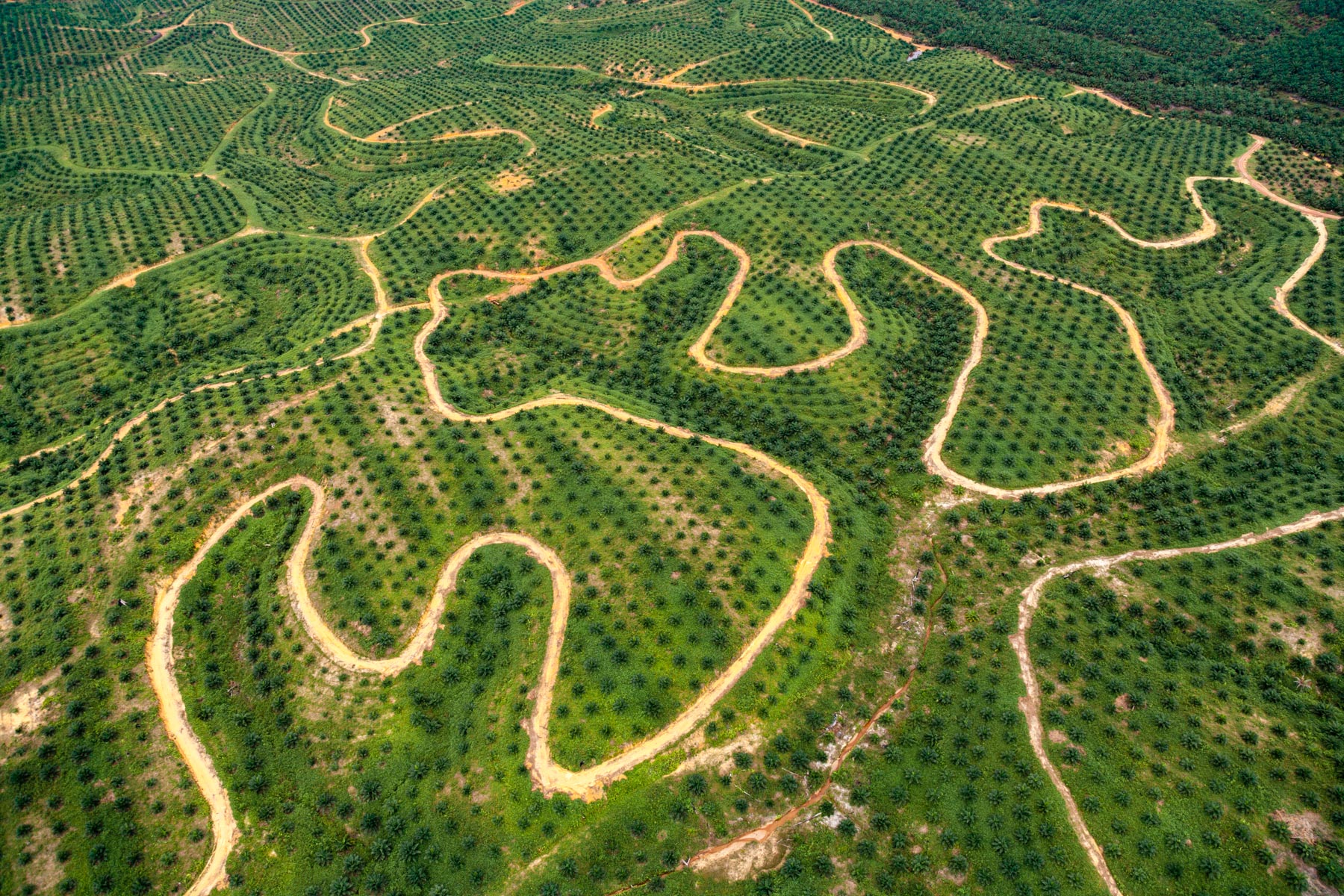 Nouvelle plantation de palmiers à huile près de Pundu, Bornéo, Indonésie (1°59’ S – 113°06’ E). Sur l’île de Bornéo, les palmiers à huile remplacent les forêts tropicales vierges à un rythme croissant, et ces plantations entraînent la perte de 80 % de la flore d’origine et de 80 à 90 % des espèces animales, comme l’orang-outan. La demande mondiale pour l’huile de palme est la principale cause de déforestation dans certaines parties de l’Asie. Au début de l’année 2010, il y avait 7,9 millions d’hectares plantés contre 600 000 en 1985, ainsi que 1,9 million d’hectares en attente de plantation. L’archipel indonésien est devenu le premier producteur mondial d’huile de palme en 2008, devant la Malaisie. La demande mondiale pour cette matière première augmente, passant de 14,5 millions de tonnes en 1990 à 56 millions de tonnes en 2013 car elle entre dans la composition de beaucoup de produits alimentaires, mais aussi dans celle des détergents et des cosmétiques. De plus en plus utilisée pour la fabrication d’agrocarburants, cette huile alimentaire pourrait devenir trop chère pour les consommateurs pauvres des pays en voie de développement. Dans l’Union européenne, l’utilisation de la moitié de la production d’huile de colza pour produire des agrocarburants contraint les pays membres à importer davantage d’huile de palme et de soja pour la consommation humaine.