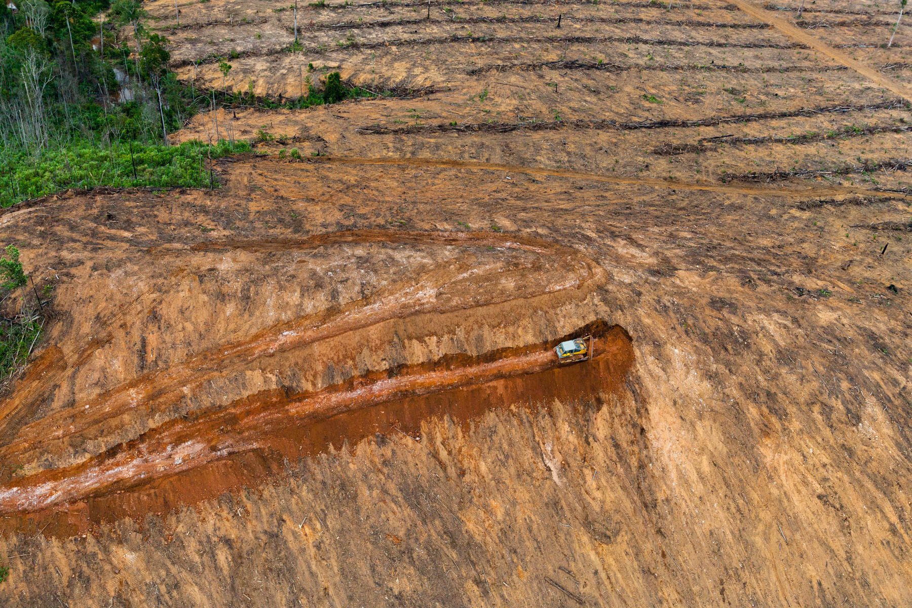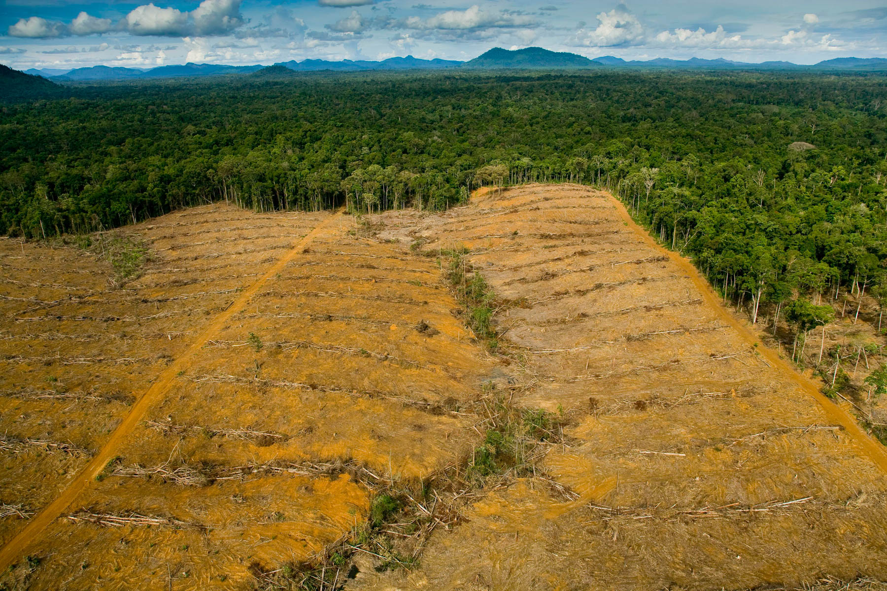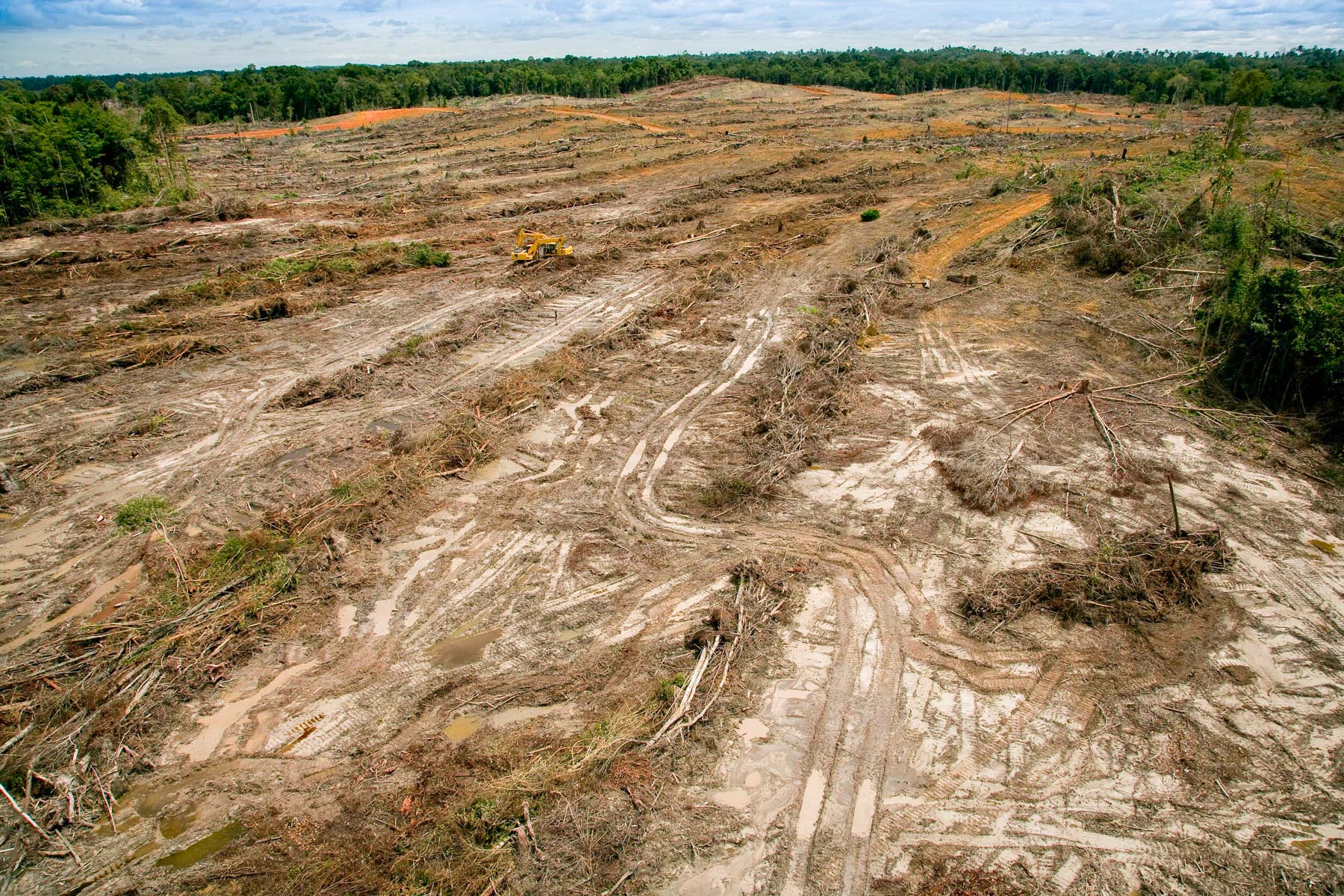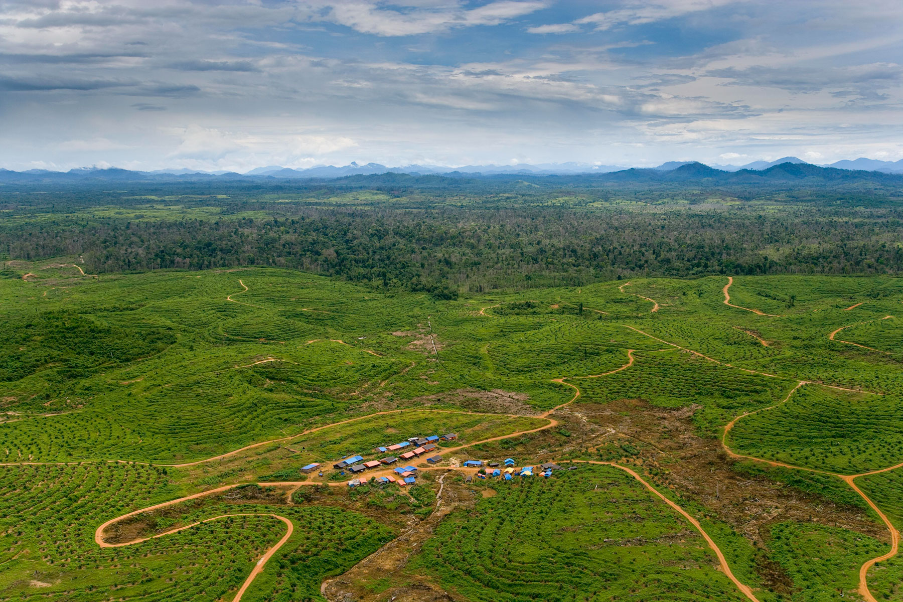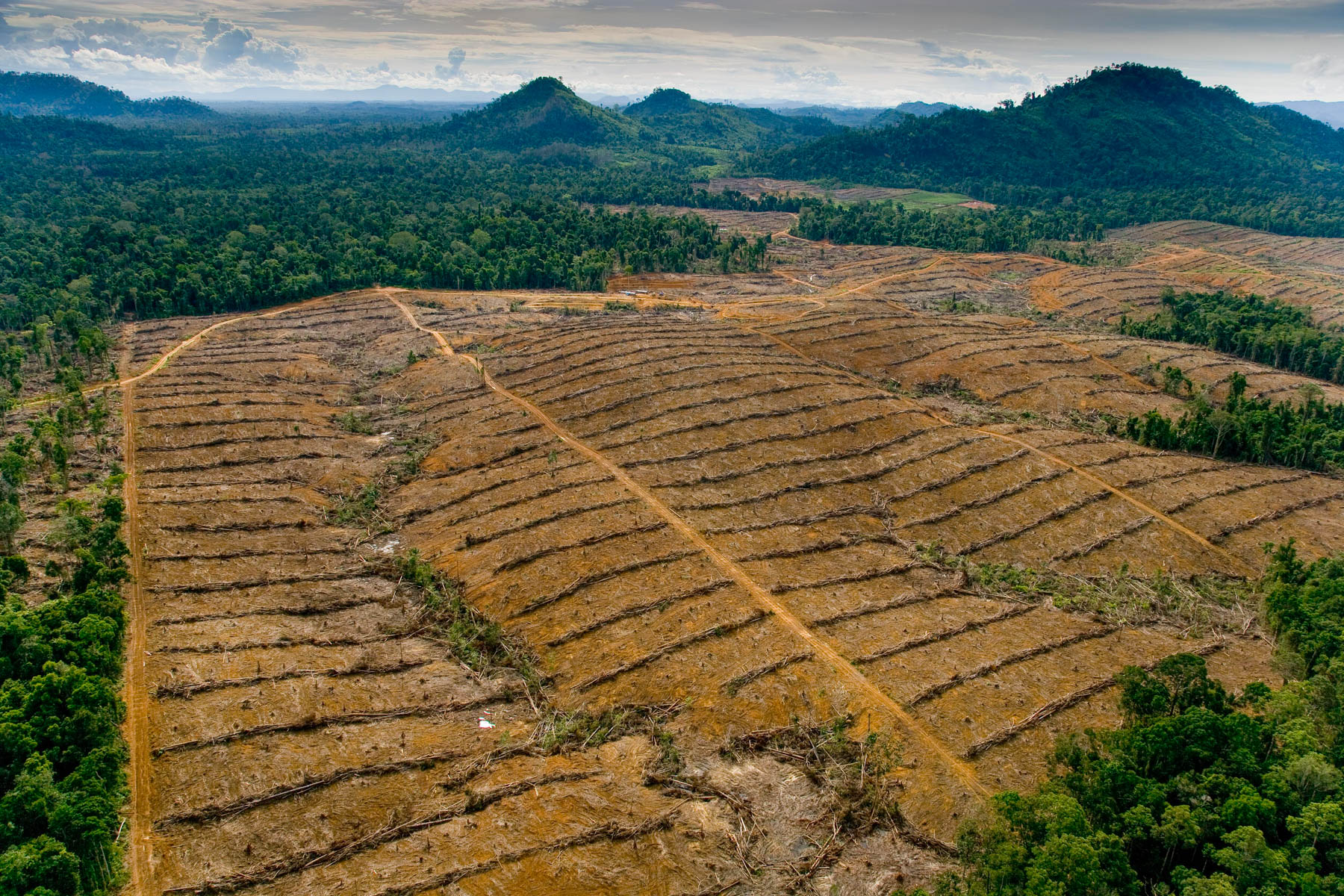 Nouvelle plantation de palmiers à huile près de Pundu, Bornéo, Indonésie (1°59’ S – 113°06’ E). Sur l’île de Bornéo, les palmiers à huile remplacent les forêts tropicales vierges à un rythme croissant, et ces plantations entraînent la perte de 80 % de la flore d’origine et de 80 à 90 % des espèces animales, comme l’orang-outan. La demande mondiale pour l’huile de palme est la principale cause de déforestation dans certaines parties de l’Asie. Au début de l’année 2010, il y avait 7,9 millions d’hectares plantés contre 600 000 en 1985, ainsi que 1,9 million d’hectares en attente de plantation. L’archipel indonésien est devenu le premier producteur mondial d’huile de palme en 2008, devant la Malaisie. La demande mondiale pour cette matière première augmente, passant de 14,5 millions de tonnes en 1990 à 56 millions de tonnes en 2013 car elle entre dans la composition de beaucoup de produits alimentaires, mais aussi dans celle des détergents et des cosmétiques. De plus en plus utilisée pour la fabrication d’agrocarburants, cette huile alimentaire pourrait devenir trop chère pour les consommateurs pauvres des pays en voie de développement. Dans l’Union européenne, l’utilisation de la moitié de la production d’huile de colza pour produire des agrocarburants contraint les pays membres à importer davantage d’huile de palme et de soja pour la consommation humaine.