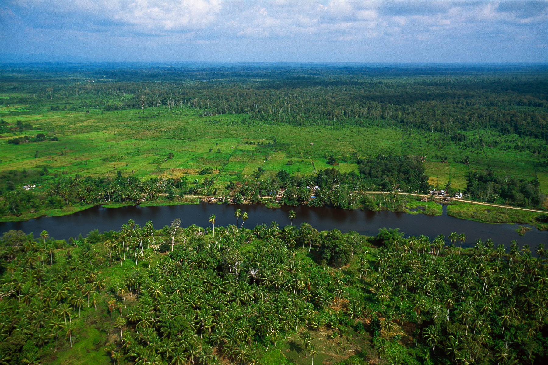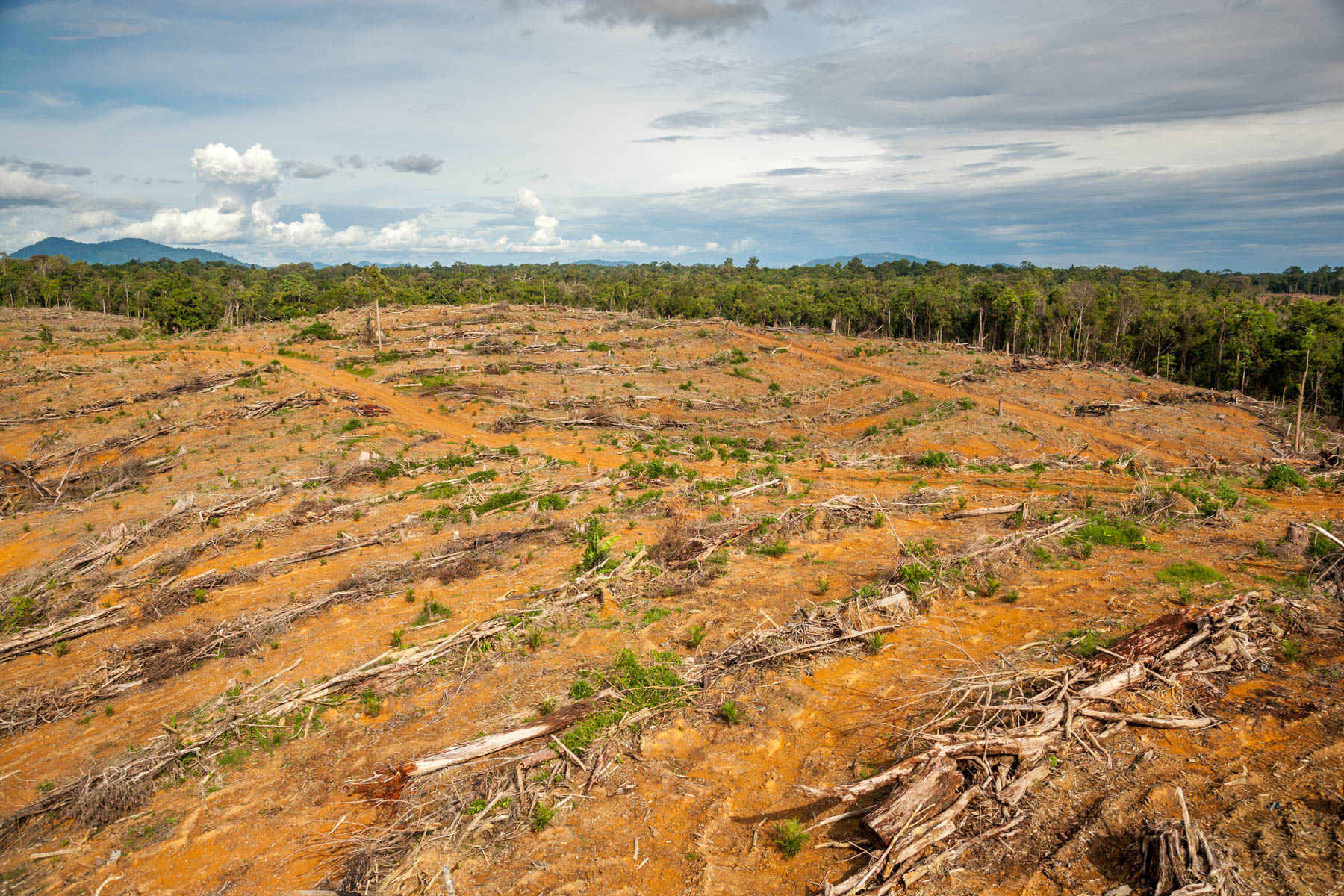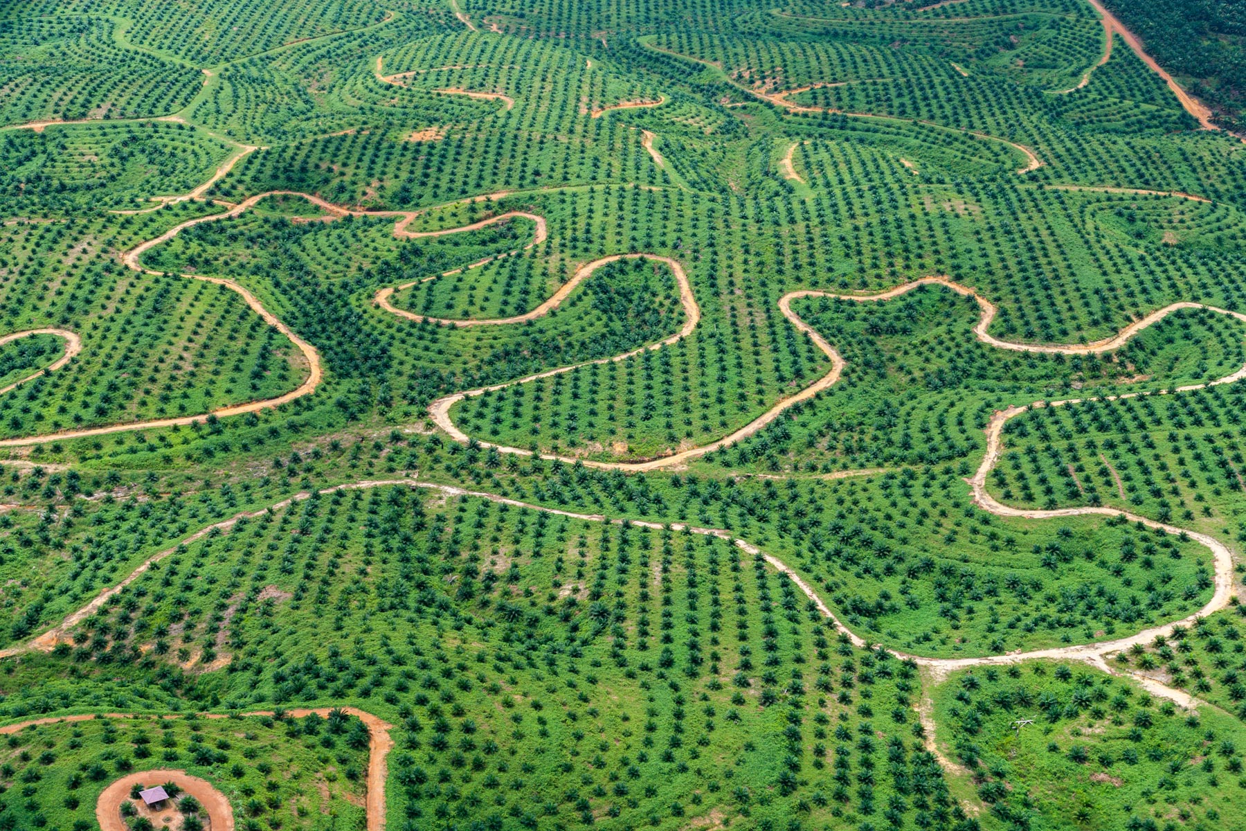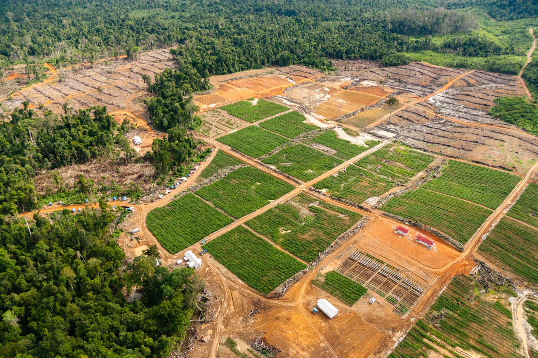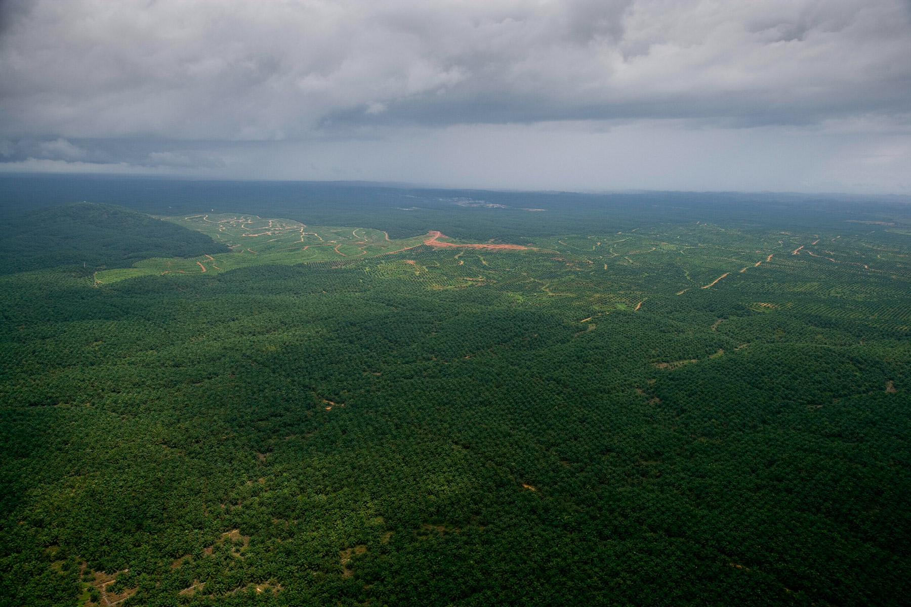 Nouvelle plantation de palmiers à huile près de Pundu, Bornéo, Indonésie (1°59’ S – 113°06’ E). Sur l’île de Bornéo, les palmiers à huile remplacent les forêts tropicales vierges à un rythme croissant, et ces plantations entraînent la perte de 80 % de la flore d’origine et de 80 à 90 % des espèces animales, comme l’orang-outan. La demande mondiale pour l’huile de palme est la principale cause de déforestation dans certaines parties de l’Asie. Au début de l’année 2010, il y avait 7,9 millions d’hectares plantés contre 600 000 en 1985, ainsi que 1,9 million d’hectares en attente de plantation. L’archipel indonésien est devenu le premier producteur mondial d’huile de palme en 2008, devant la Malaisie. La demande mondiale pour cette matière première augmente, passant de 14,5 millions de tonnes en 1990 à 56 millions de tonnes en 2013 car elle entre dans la composition de beaucoup de produits alimentaires, mais aussi dans celle des détergents et des cosmétiques. De plus en plus utilisée pour la fabrication d’agrocarburants, cette huile alimentaire pourrait devenir trop chère pour les consommateurs pauvres des pays en voie de développement. Dans l’Union européenne, l’utilisation de la moitié de la production d’huile de colza pour produire des agrocarburants contraint les pays membres à importer davantage d’huile de palme et de soja pour la consommation humaine.