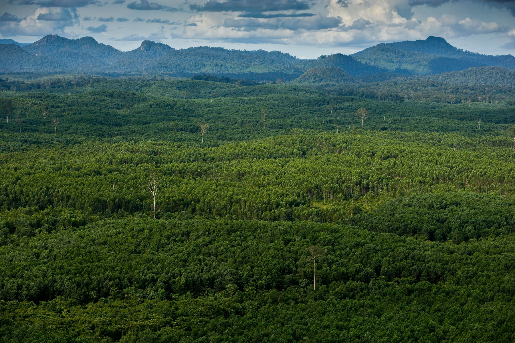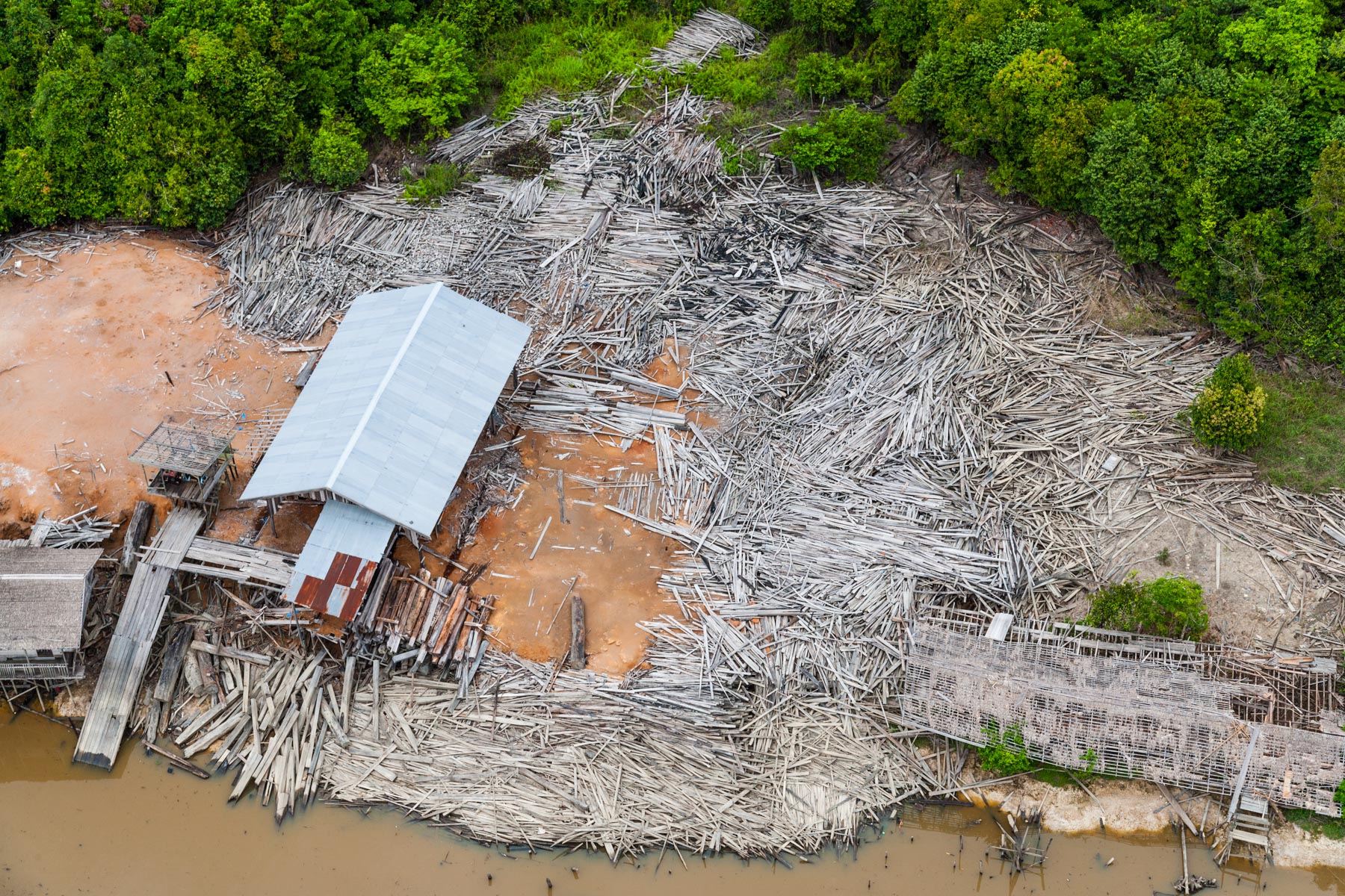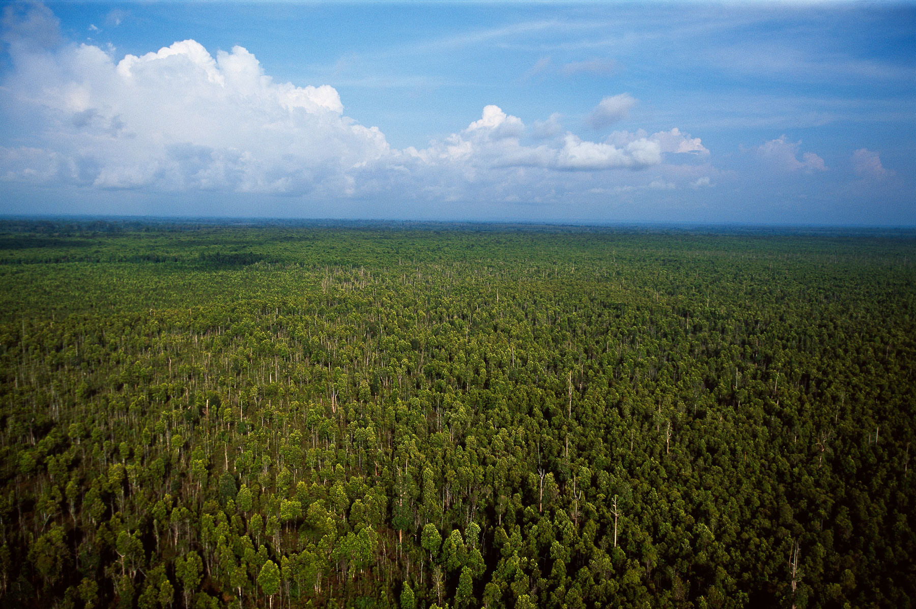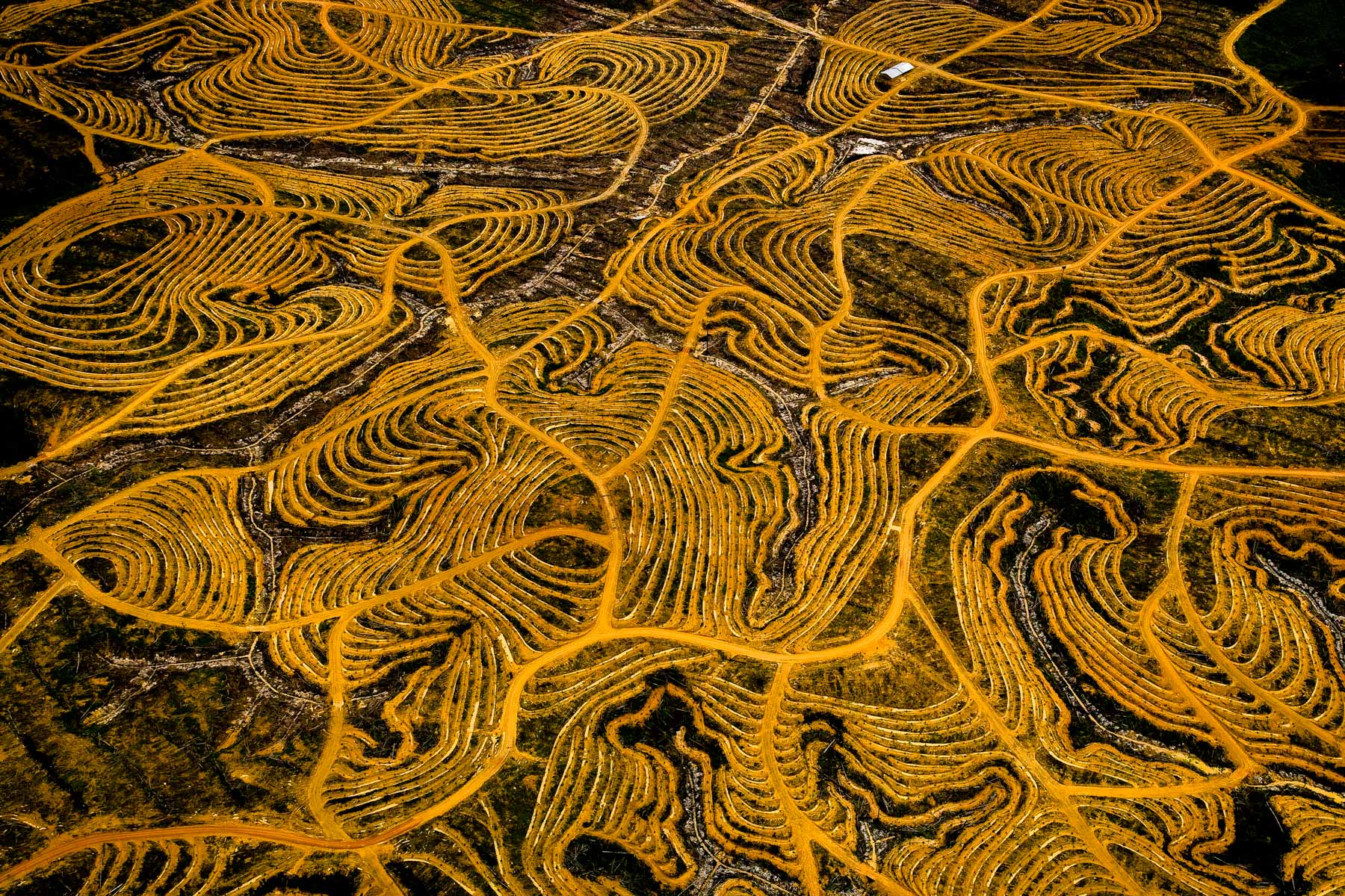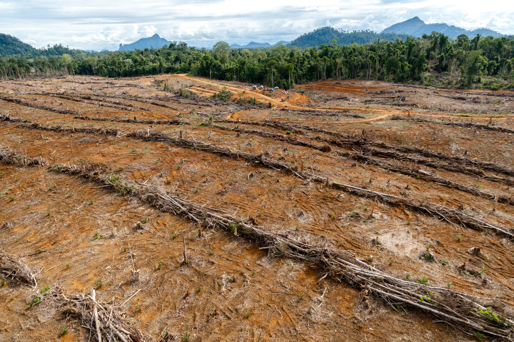 Nouvelle plantation de palmiers à huile près de Pundu, Bornéo, Indonésie (1°59’ S – 113°06’ E). Sur l’île de Bornéo, les palmiers à huile remplacent les forêts tropicales vierges à un rythme croissant, et ces plantations entraînent la perte de 80 % de la flore d’origine et de 80 à 90 % des espèces animales, comme l’orang-outan. La demande mondiale pour l’huile de palme est la principale cause de déforestation dans certaines parties de l’Asie. Au début de l’année 2010, il y avait 7,9 millions d’hectares plantés contre 600 000 en 1985, ainsi que 1,9 million d’hectares en attente de plantation. L’archipel indonésien est devenu le premier producteur mondial d’huile de palme en 2008, devant la Malaisie. La demande mondiale pour cette matière première augmente, passant de 14,5 millions de tonnes en 1990 à 56 millions de tonnes en 2013 car elle entre dans la composition de beaucoup de produits alimentaires, mais aussi dans celle des détergents et des cosmétiques. De plus en plus utilisée pour la fabrication d’agrocarburants, cette huile alimentaire pourrait devenir trop chère pour les consommateurs pauvres des pays en voie de développement. Dans l’Union européenne, l’utilisation de la moitié de la production d’huile de colza pour produire des agrocarburants contraint les pays membres à importer davantage d’huile de palme et de soja pour la consommation humaine.