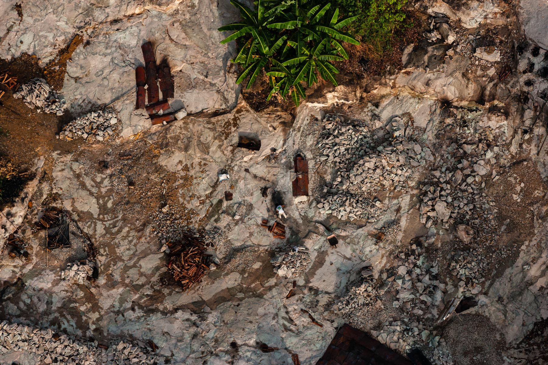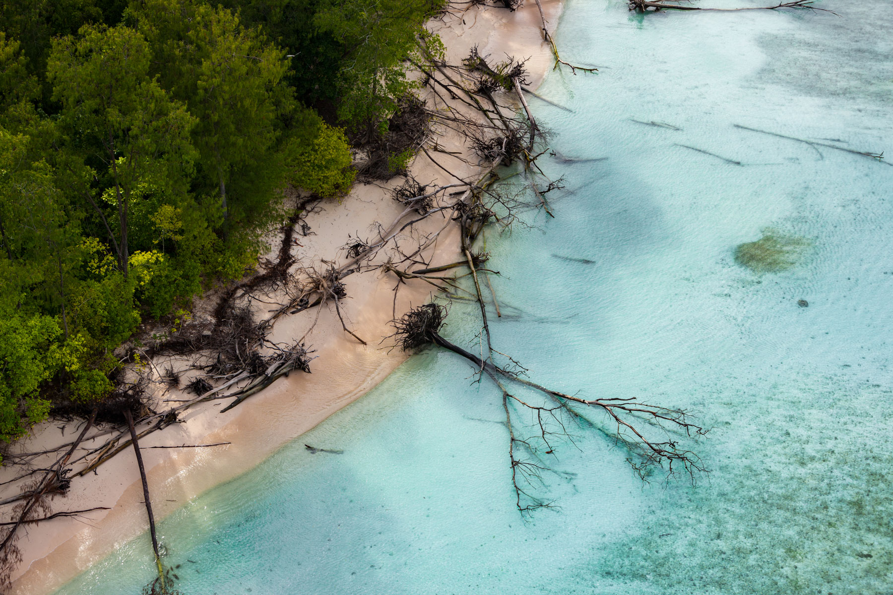 Archipel des Raja-Ampat (les quatre rois) : Arbres déracinés sur l'île Pulau Wai, province de Papouasie Occidentale, Indonésie (0°41'56.13"S -130°42'30.50"E)