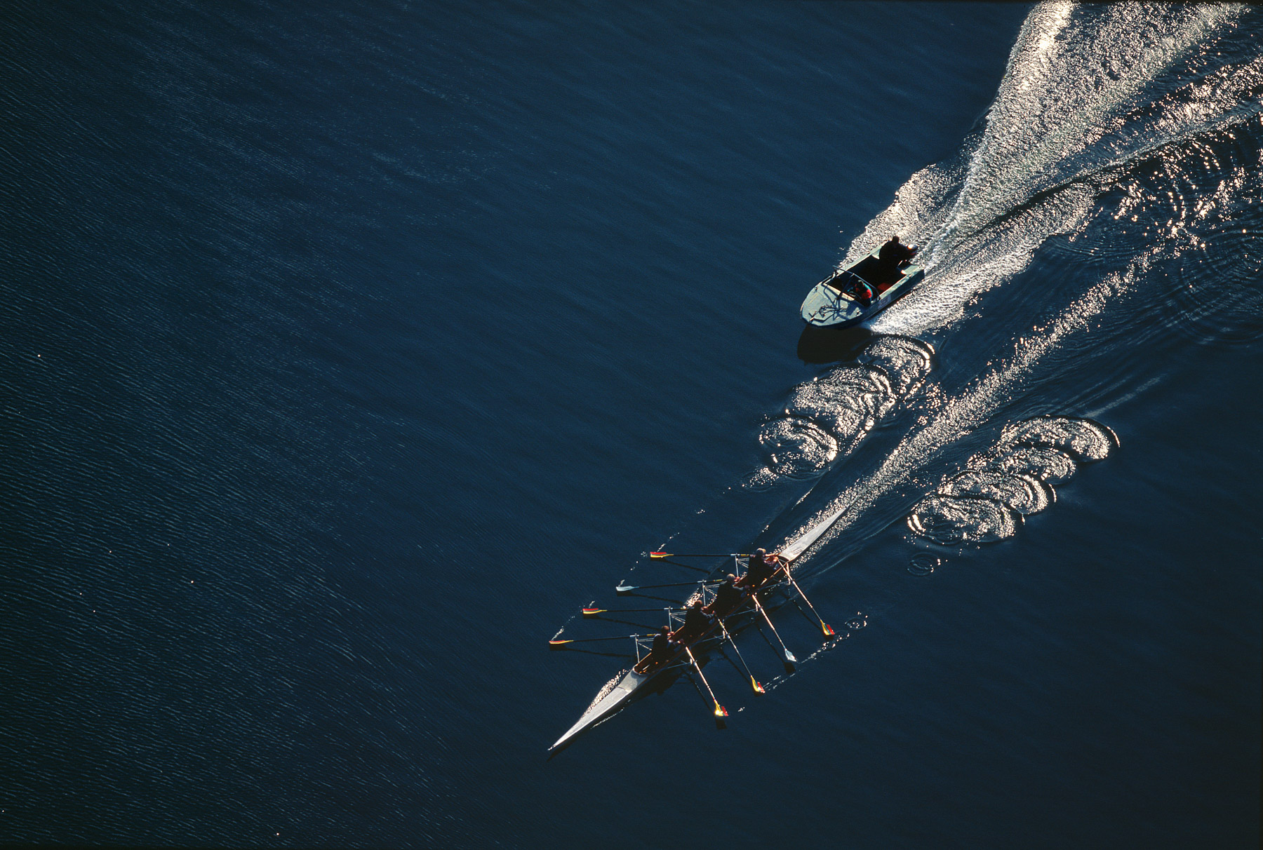 Rameurs en aviron, sur le lac de Trakaï, Lituanie