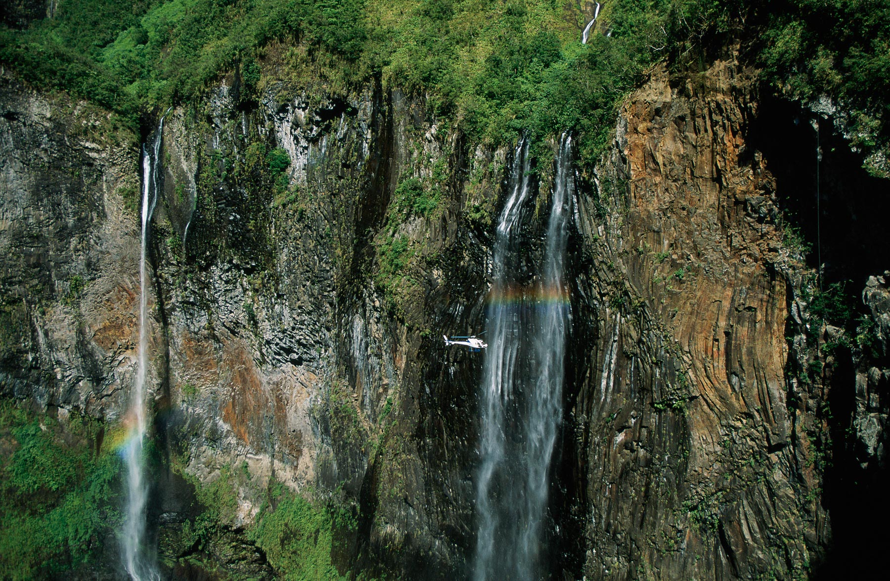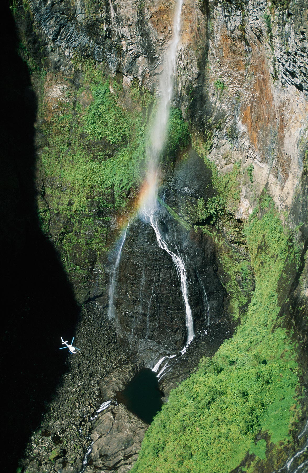 Hélicoptère et cascade dans le Trou de fer, Ile de la Réunion, France