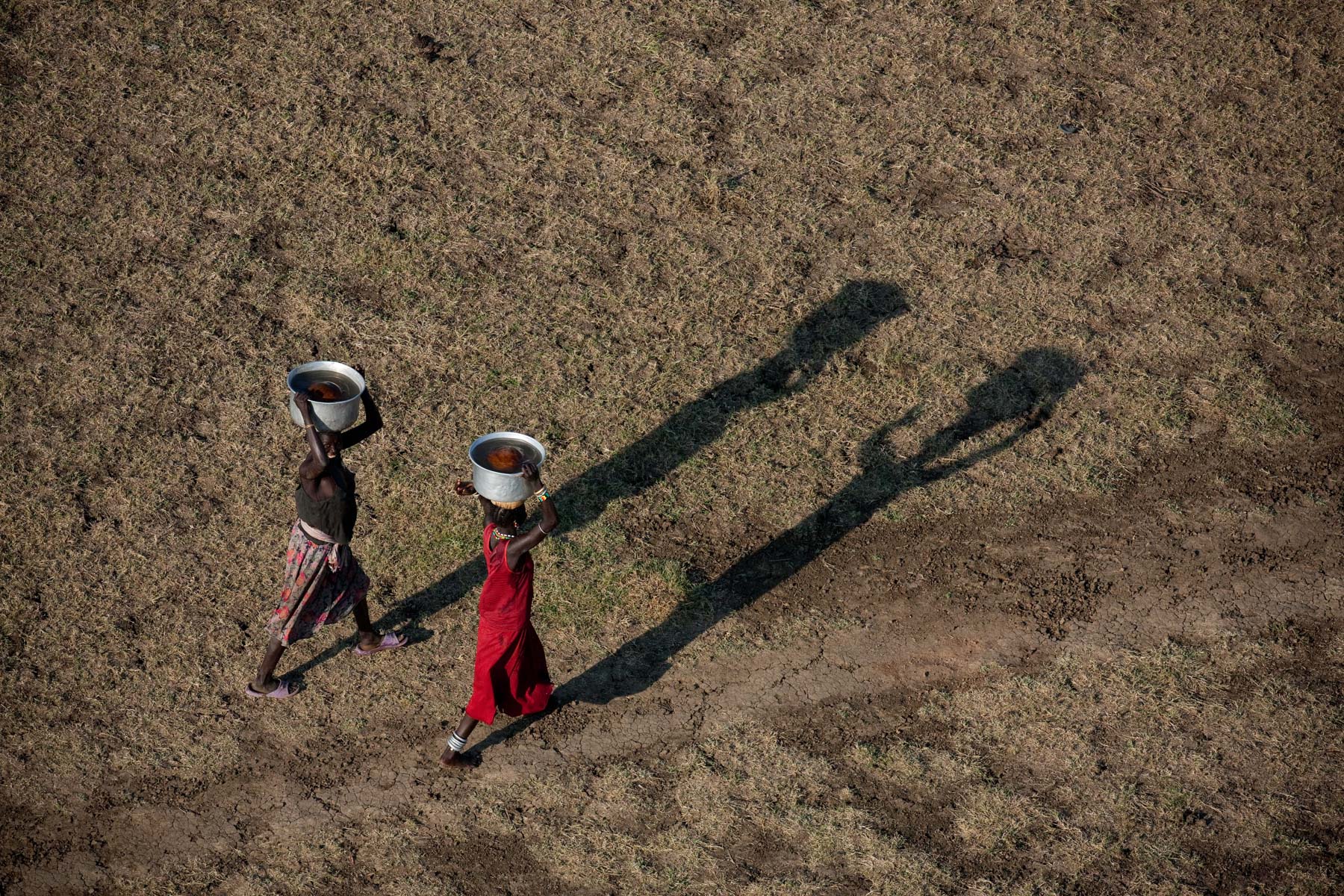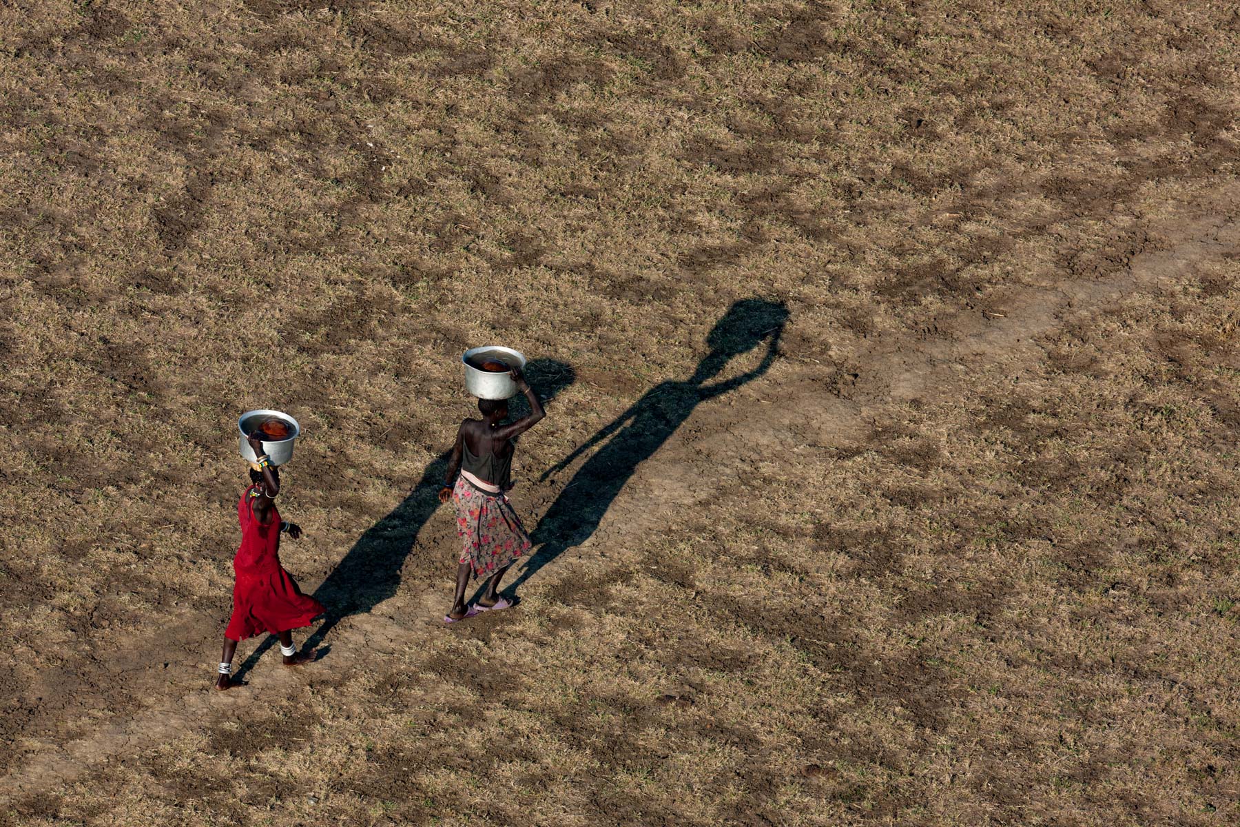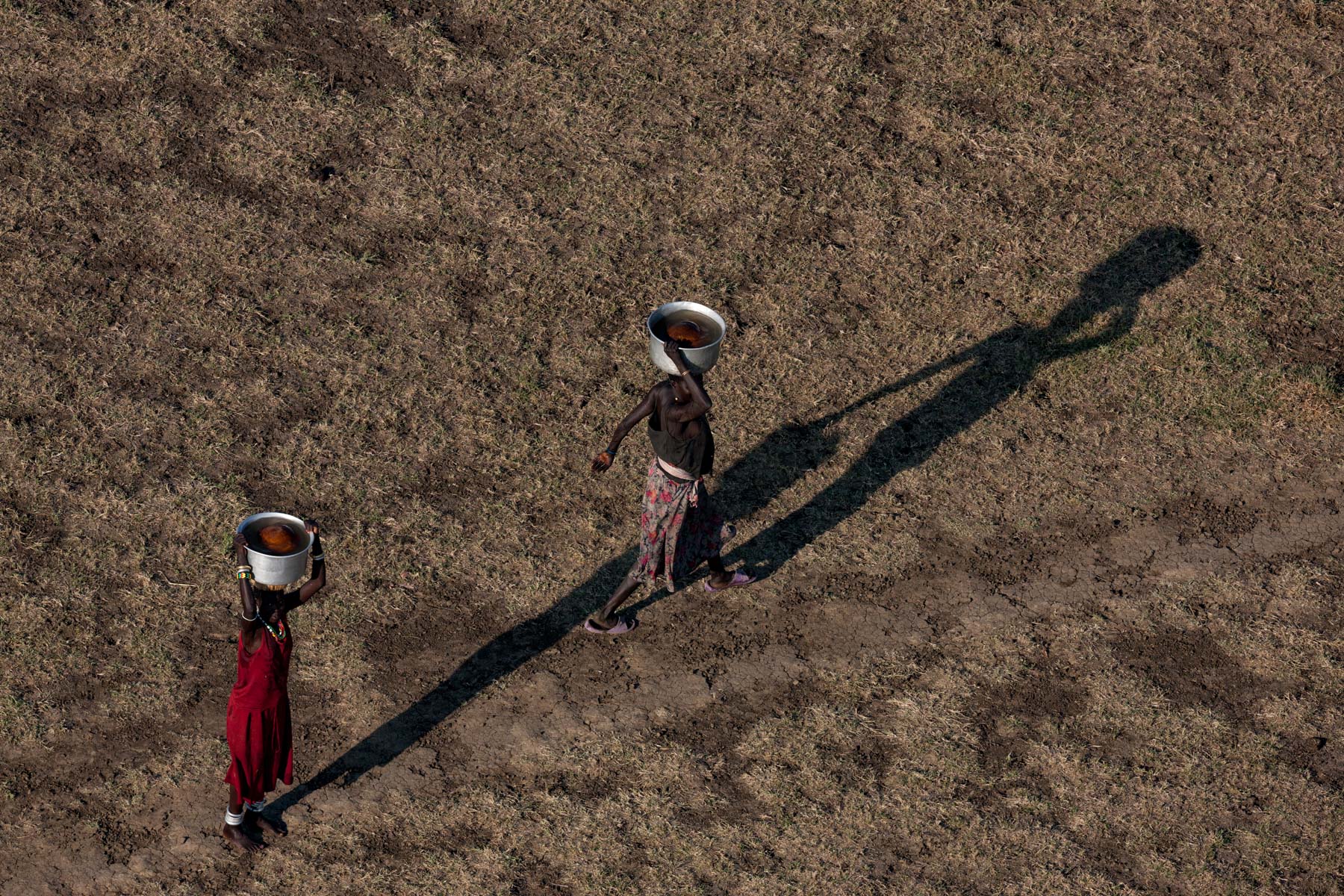 Femmes portant de l'eau dans un village près de Lafon (nord de Torit), état de Équatoria-Oriental, Soudan du Sud ( 5° 5'43.20"N - 32°28'51.25"E)