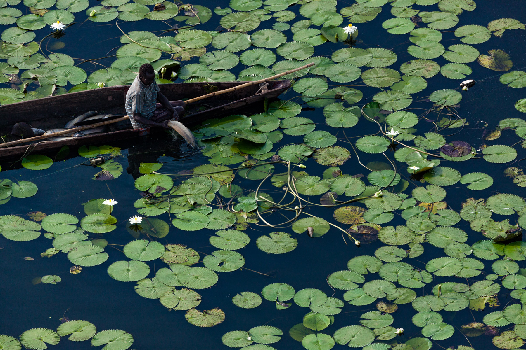 Barque de pêcheur au milieu des nénuphars dans les marais du Nil Blanc près de Gwojo-adung (nord de Djouba), état de Équatoria-Central, Soudan du Sud
