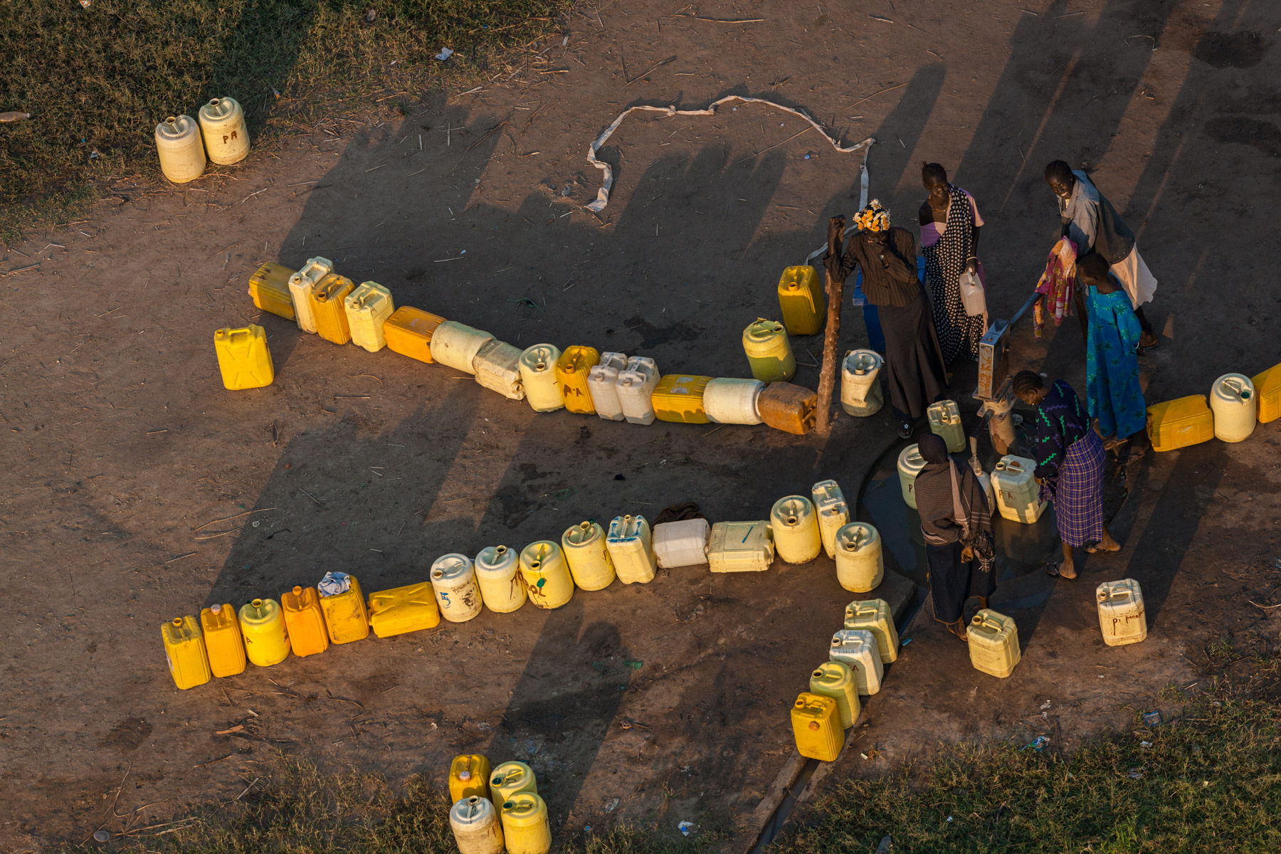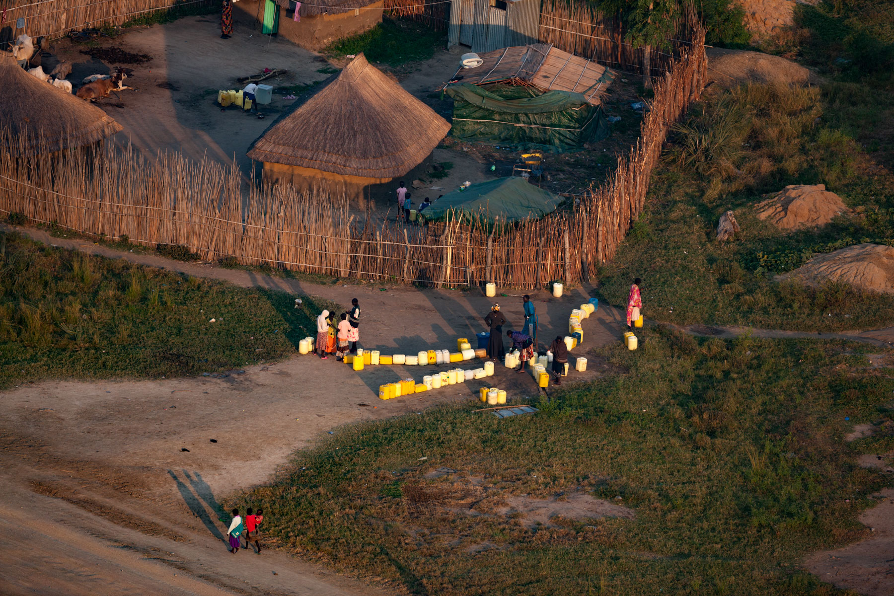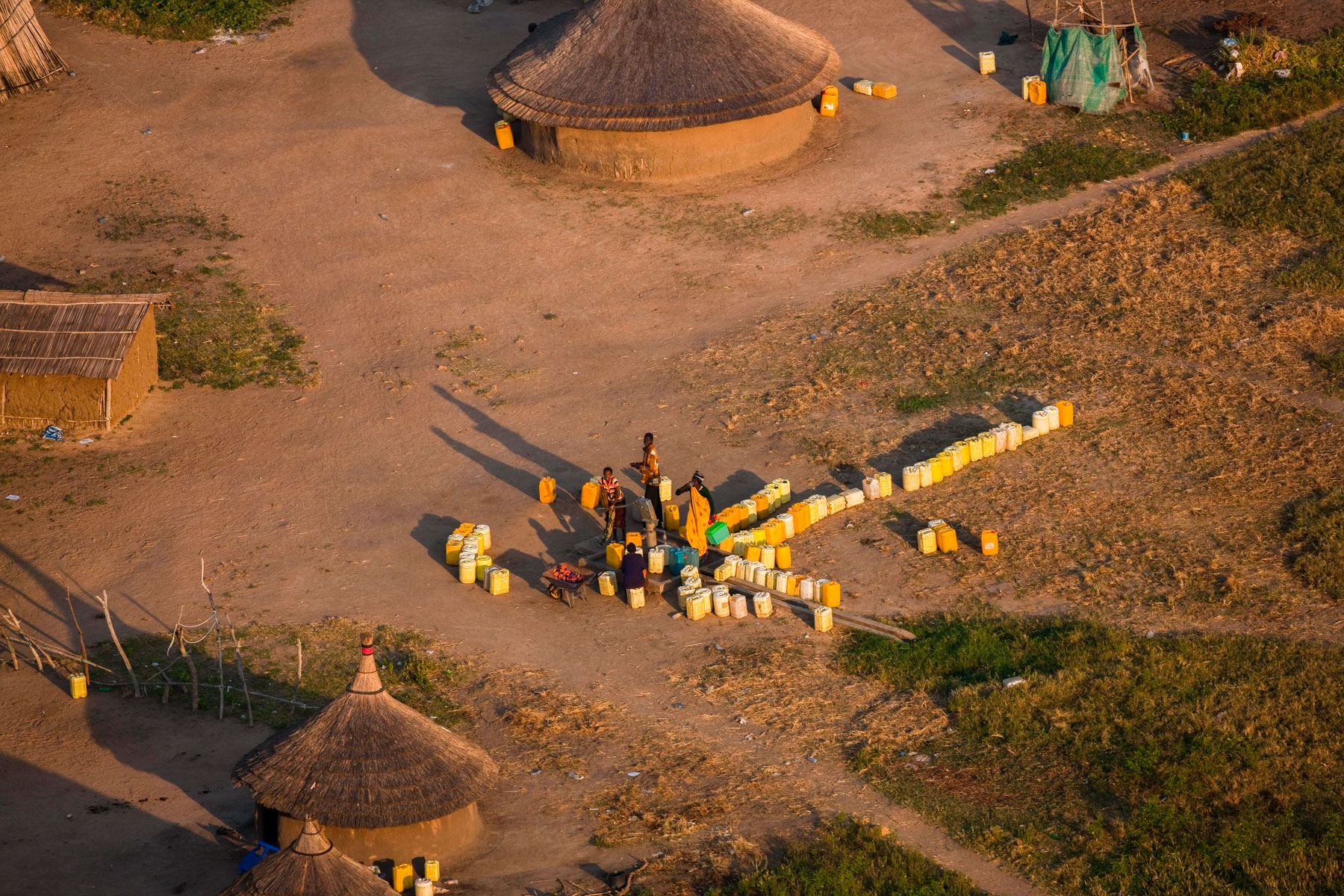 Remplissage de jerricans d’eau par des villageoises à la fontaine près de Bor, état de Jonglei, Soudan du Sud (6° 26’ 41,21” N – 31° 33’ 10,47” E).