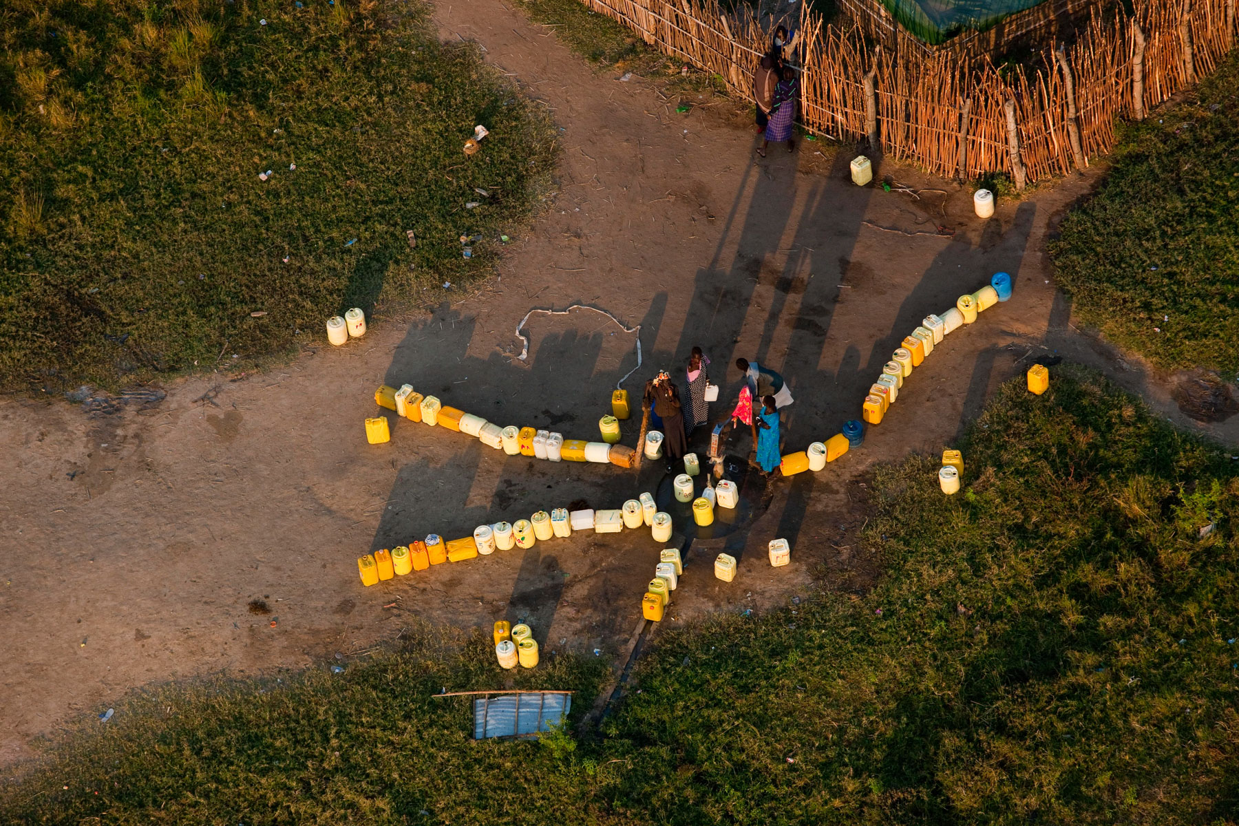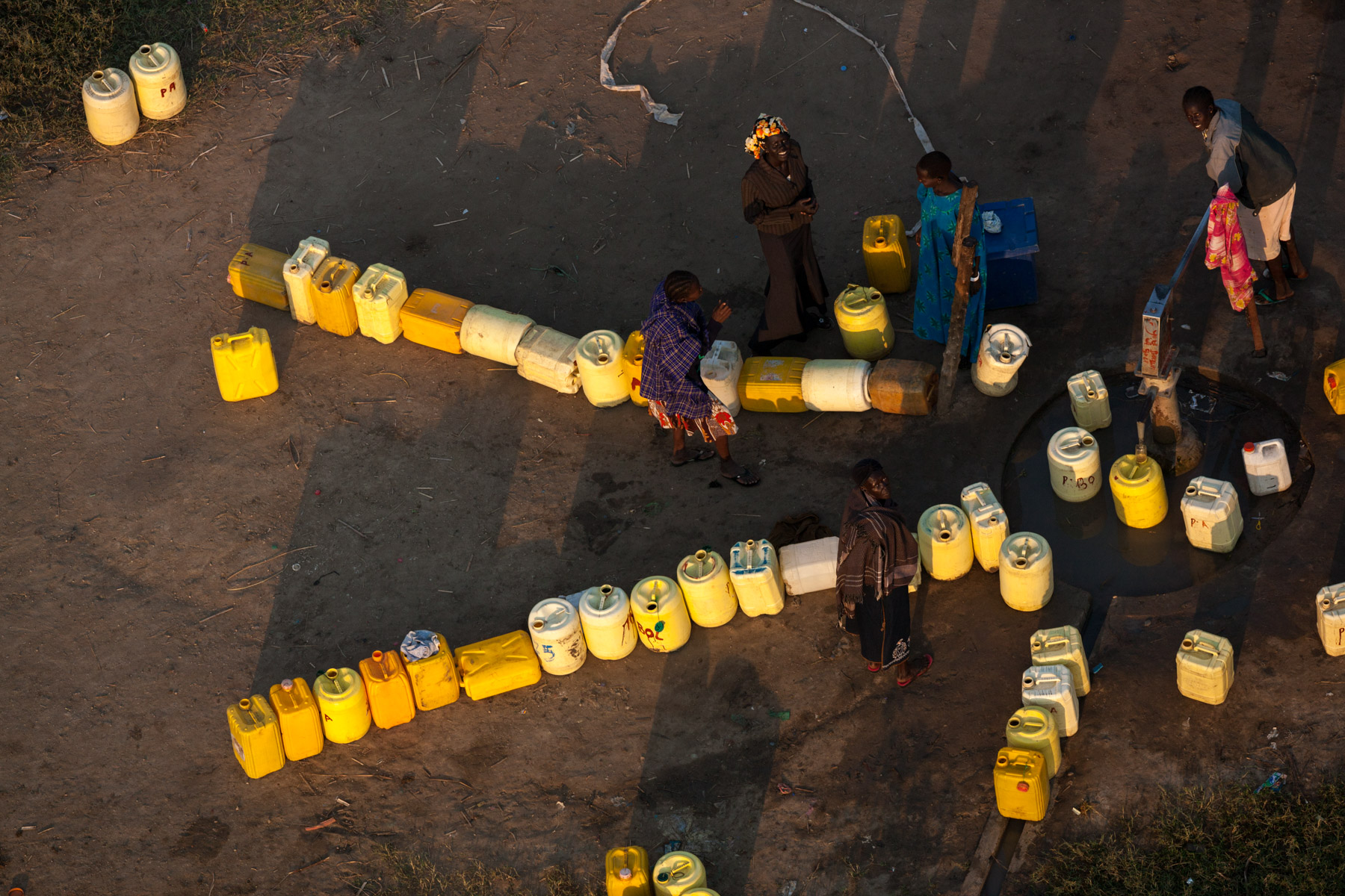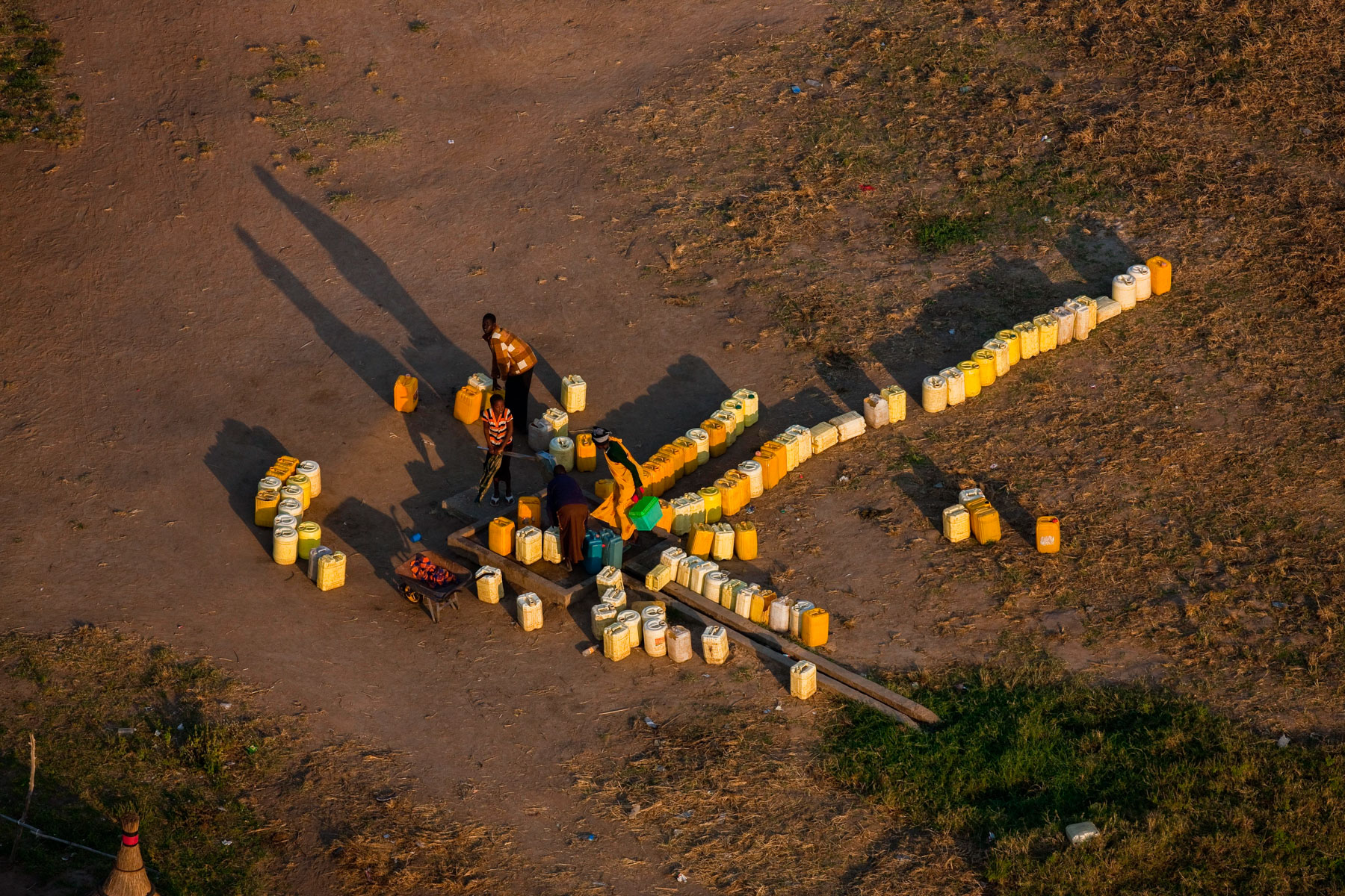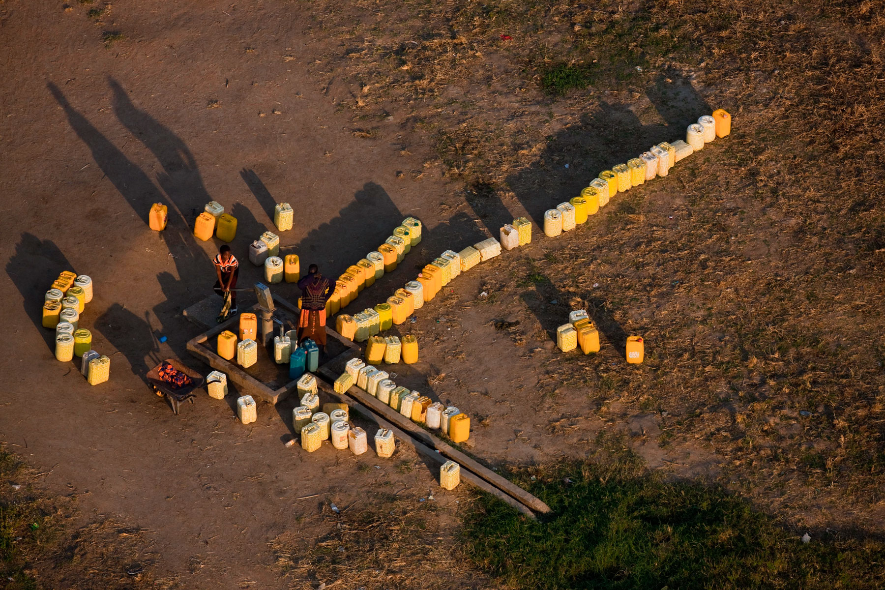 Remplissage de jerricans d’eau par des villageoises à la fontaine près de Bor, état de Jonglei, Soudan du Sud (6° 26’ 41,21” N – 31° 33’ 10,47” E).