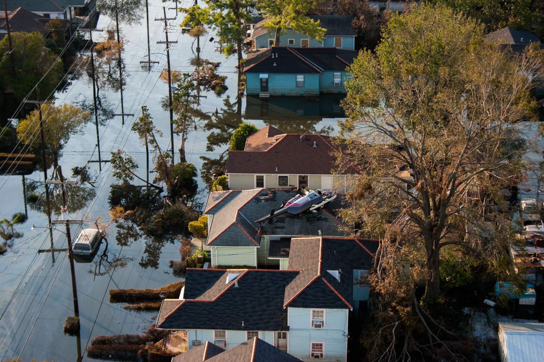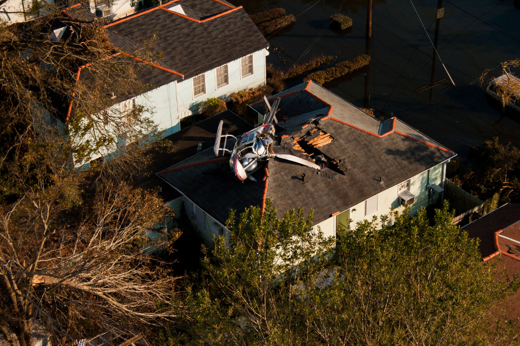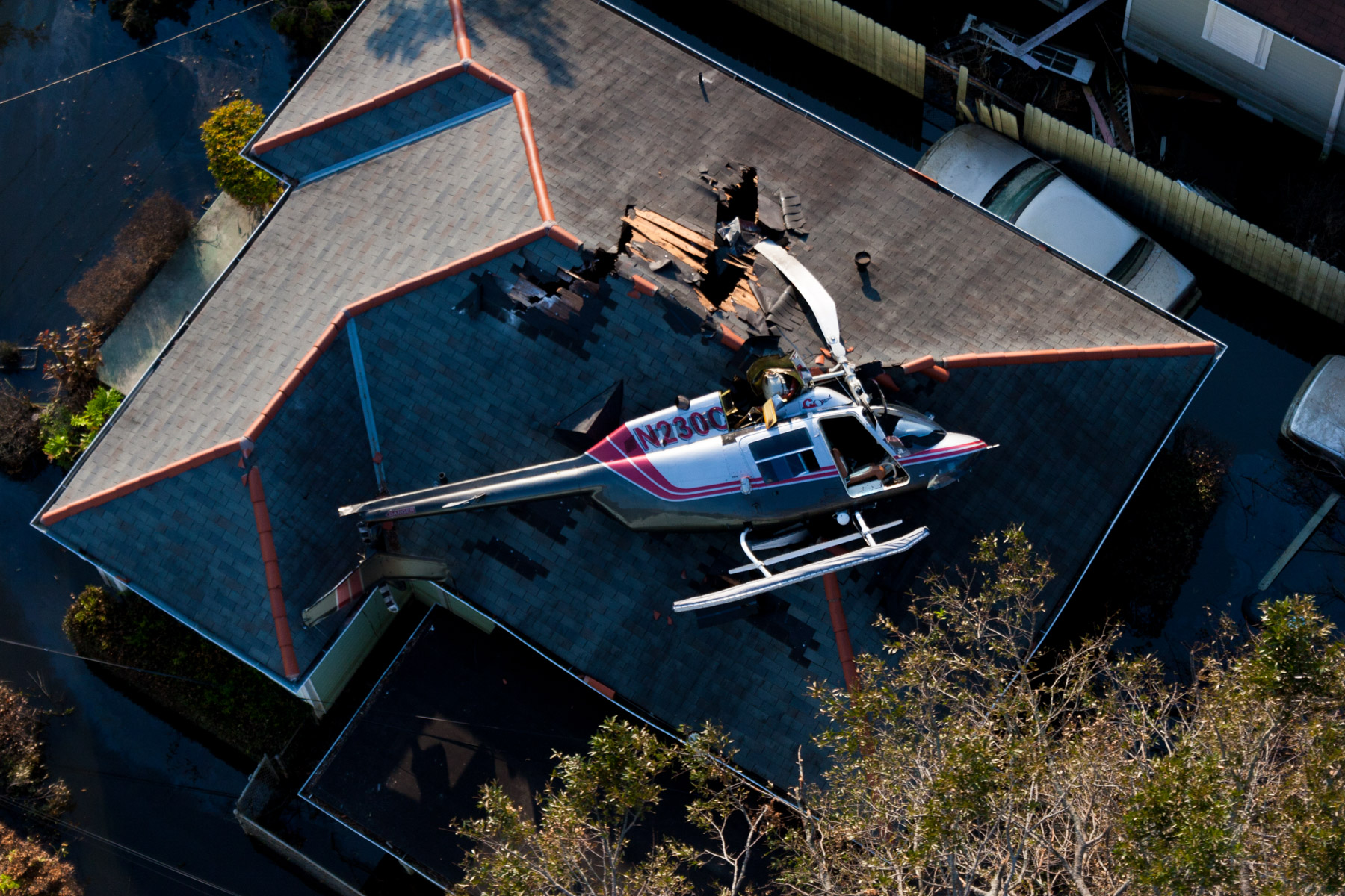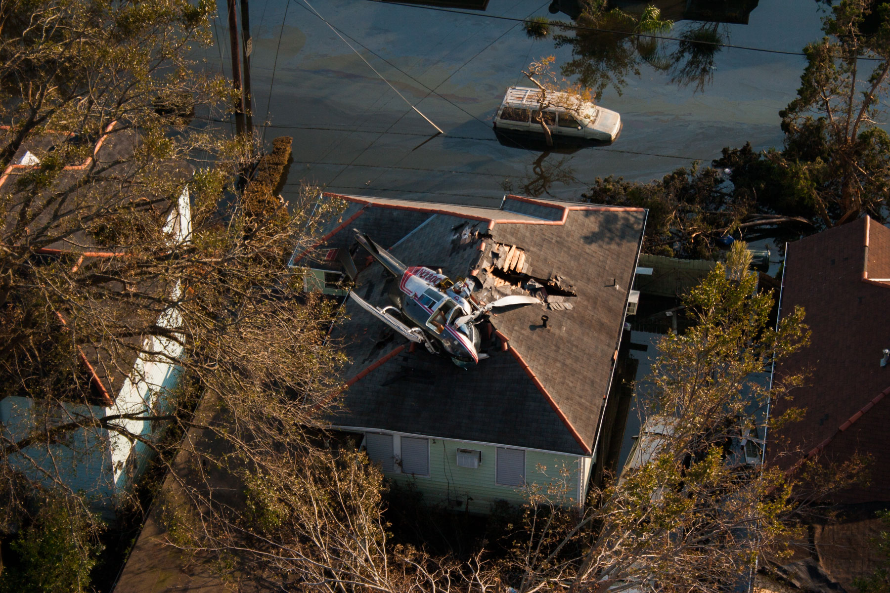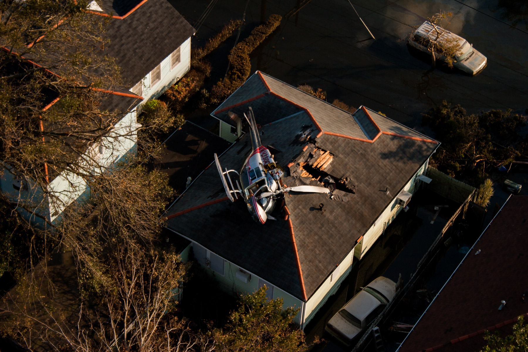 La Nouvelle-Orléans inondée après le passage de l’ouragan Katrina - Crah de l'hélicoptère de Yann Arthus-Bertrand sur le toit d'une maison, Louisiane, Etats-Unis