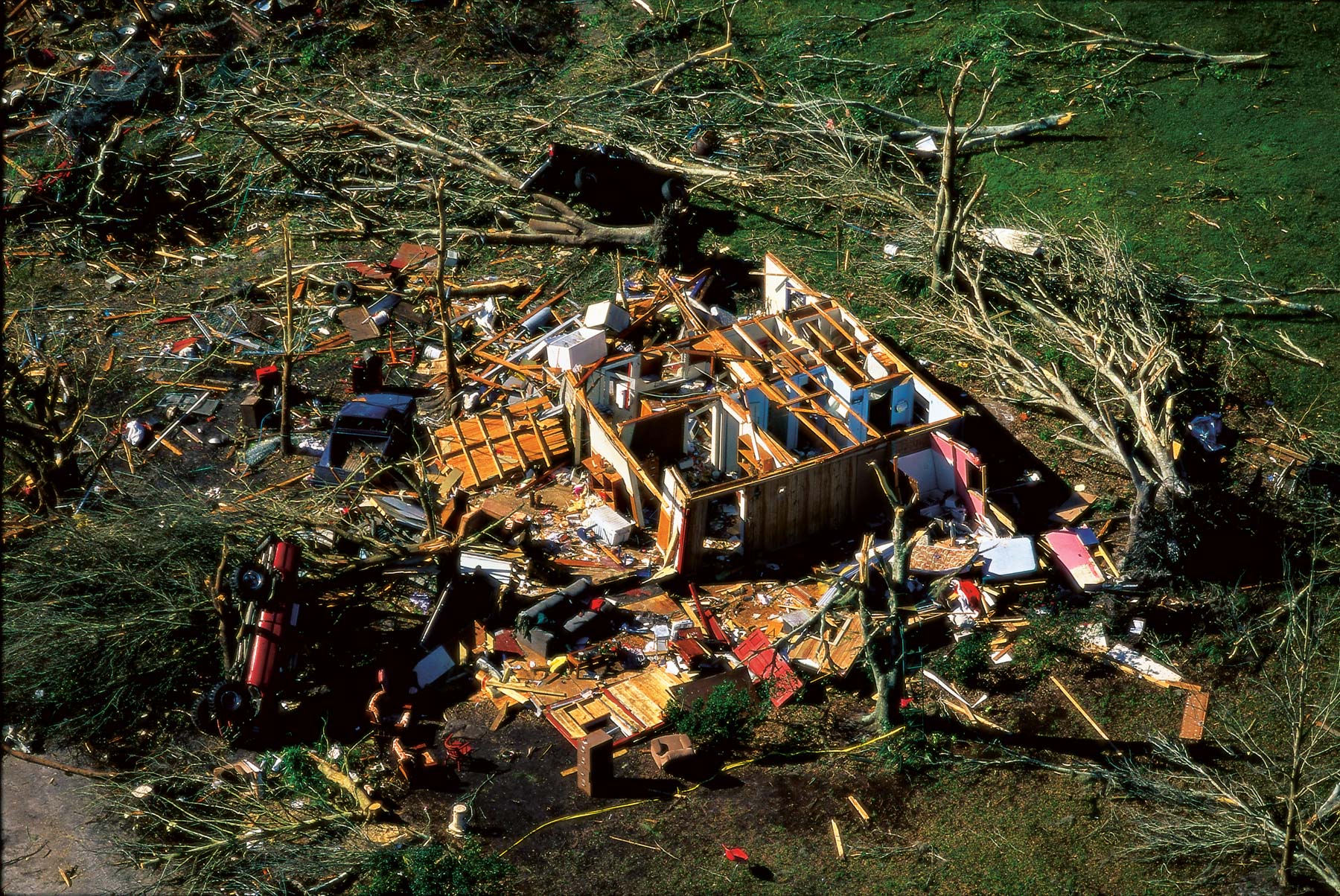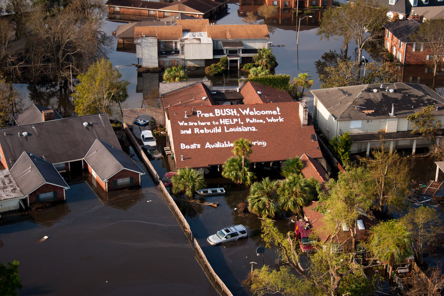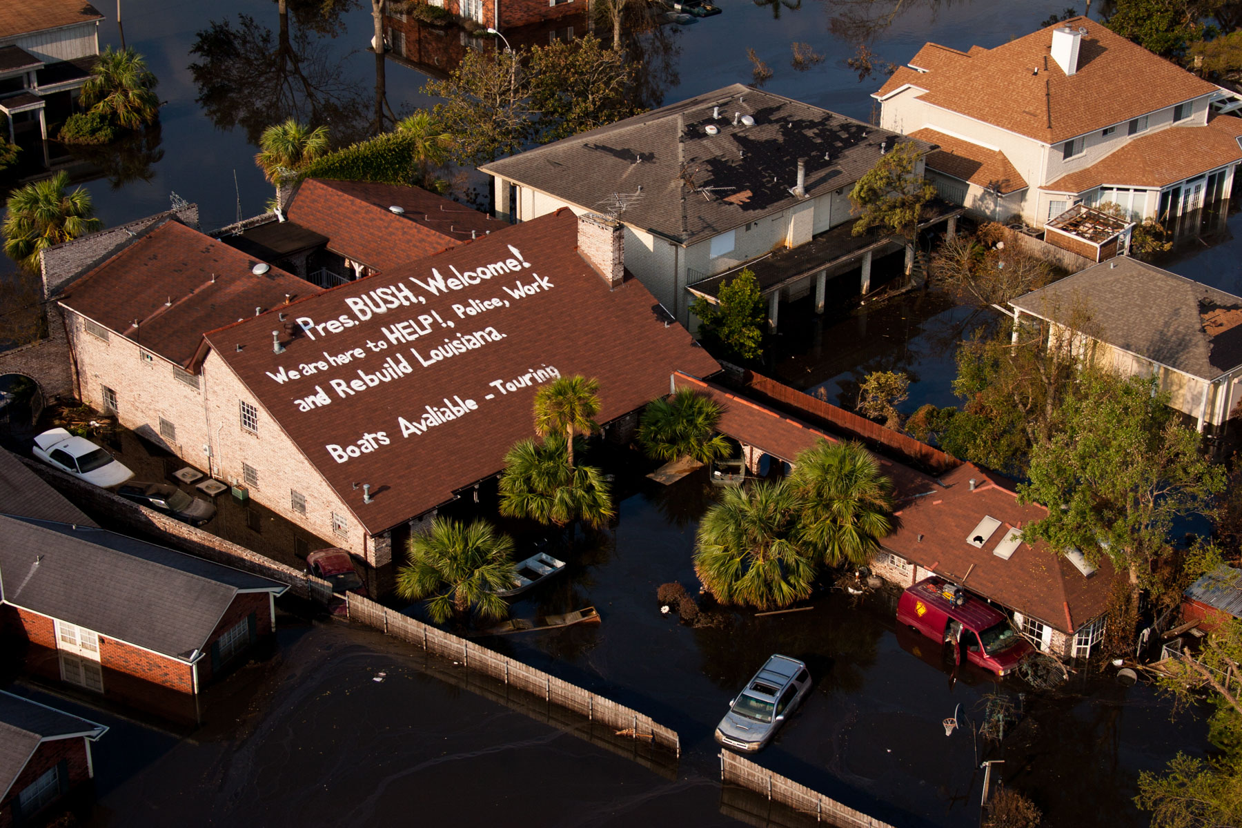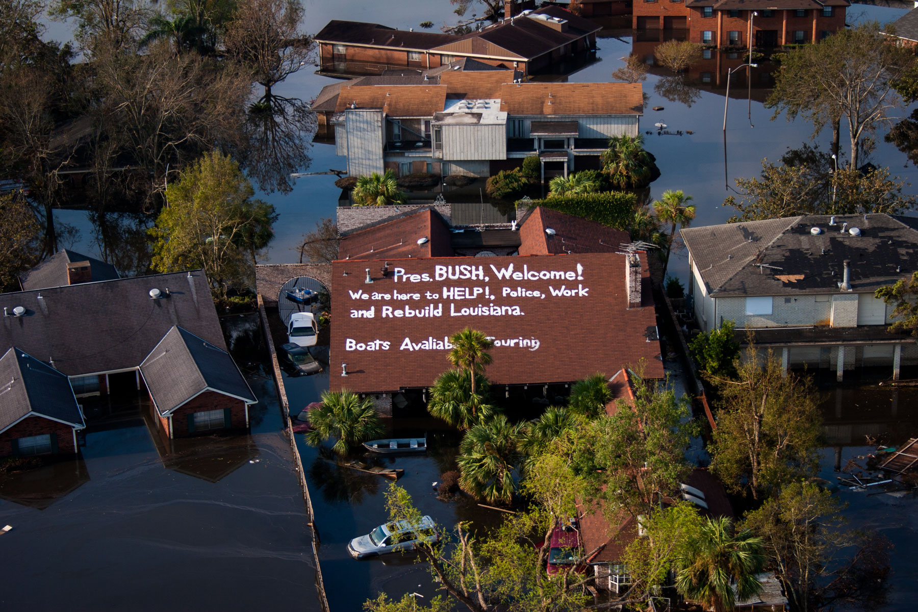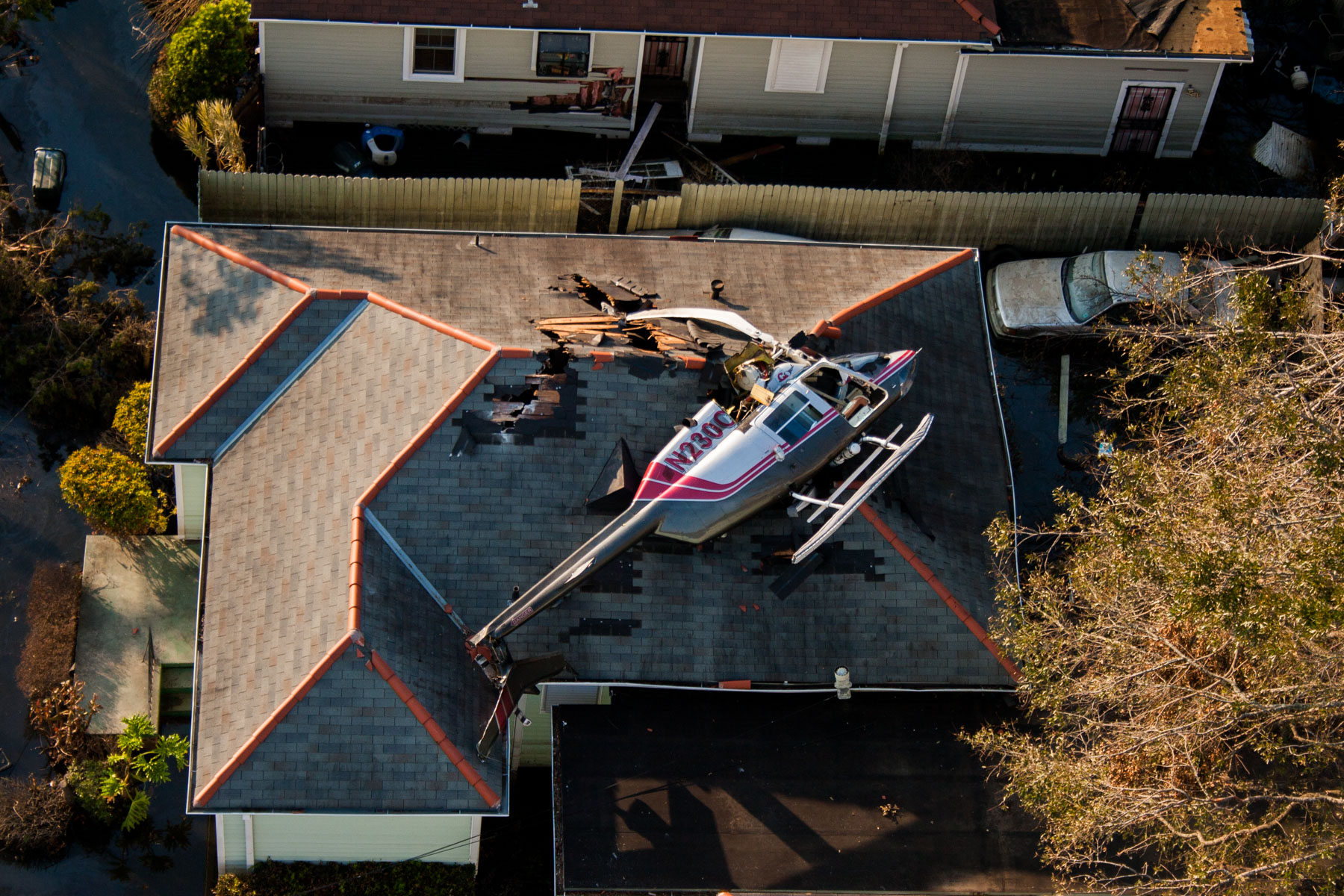 La Nouvelle-Orléans inondée après le passage de l’ouragan Katrina - Crah de l'hélicoptère de Yann Arthus-Bertrand sur le toit d'une maison, Louisiane, Etats-Unis