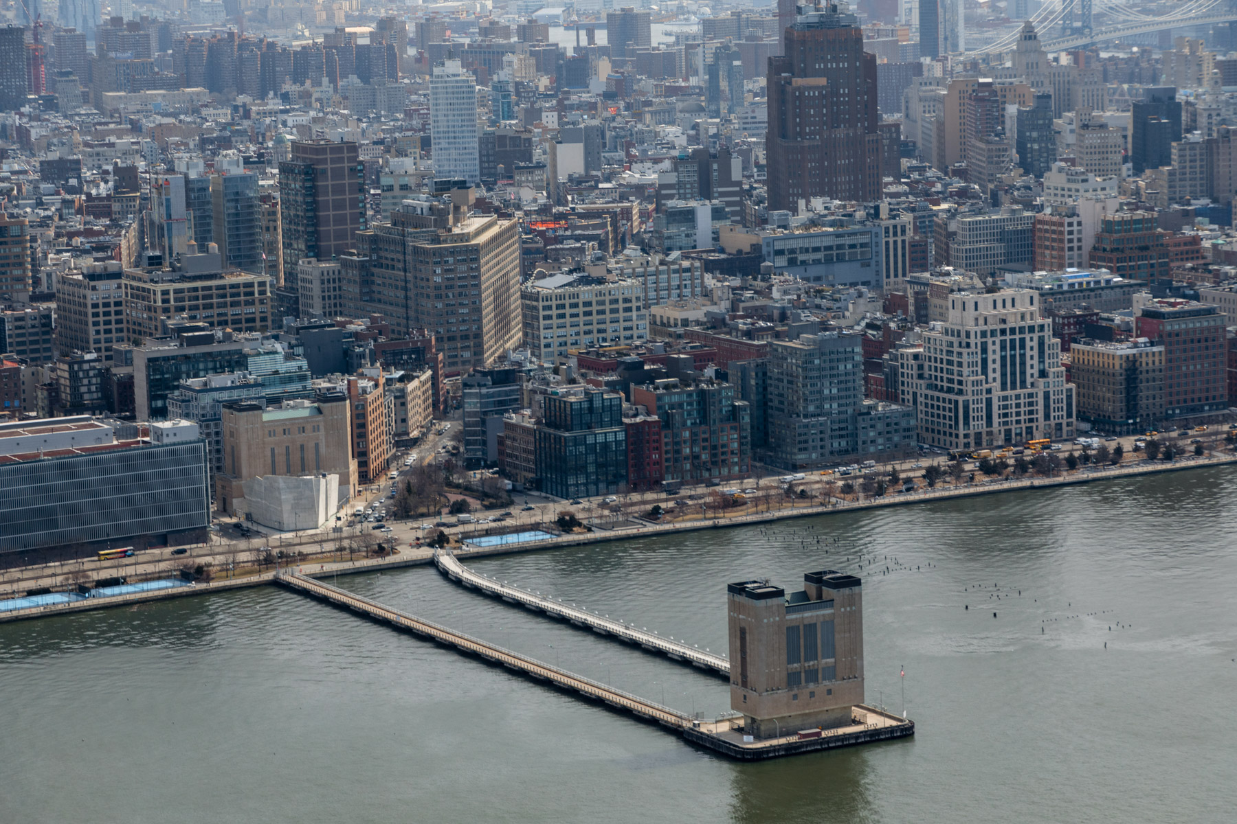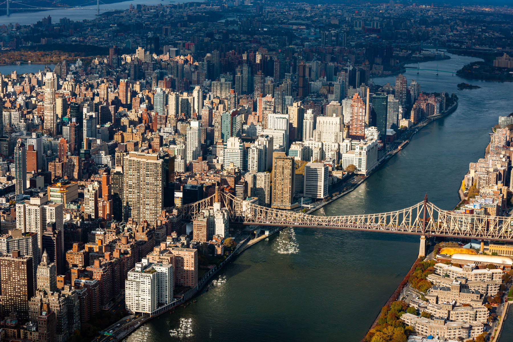 The Mayor Edward Koch Bridge or Queensboro Bridge and Roosevelt Island in the East River, between Manhattan and Queens, New York, United States (40°45’ N, 73°57’ W).