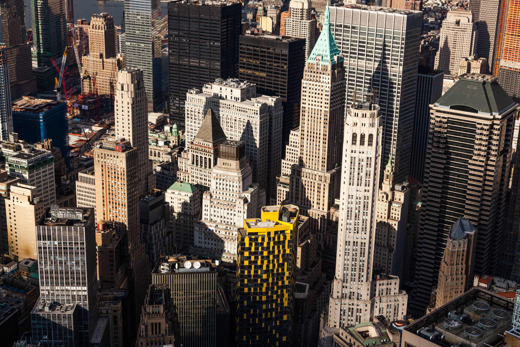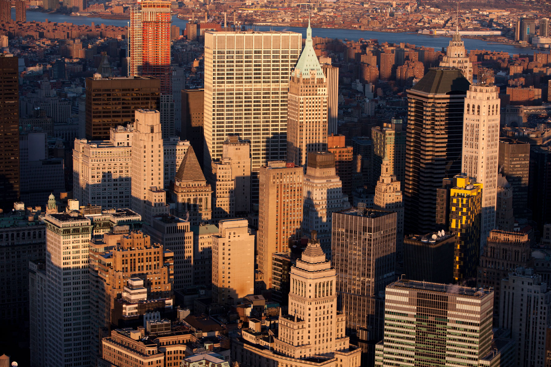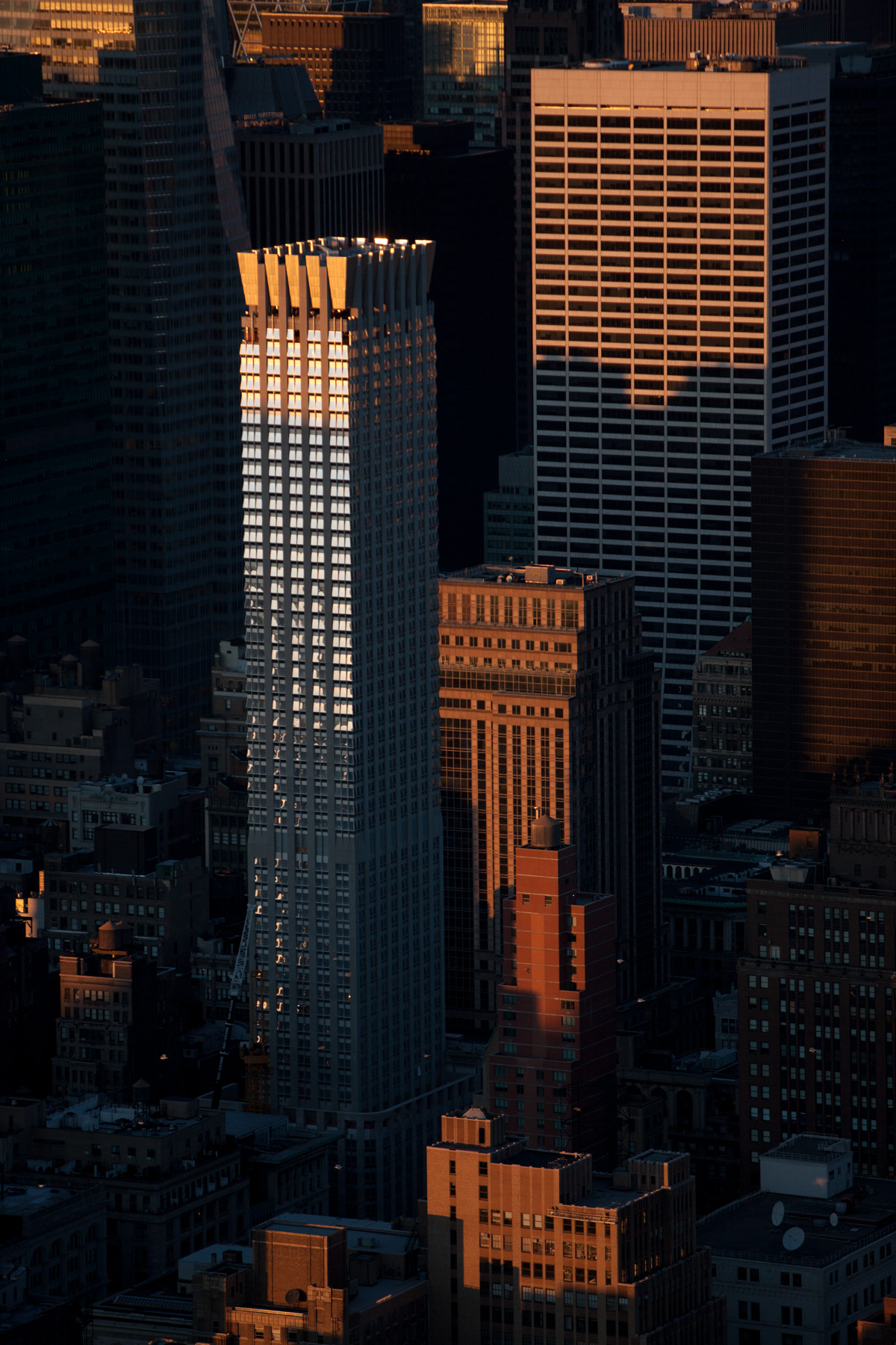 One Worldwide Plaza and Empire State Building in Midtown, Manhattan, New York, United States (40°46’ N, 73°59’ W).