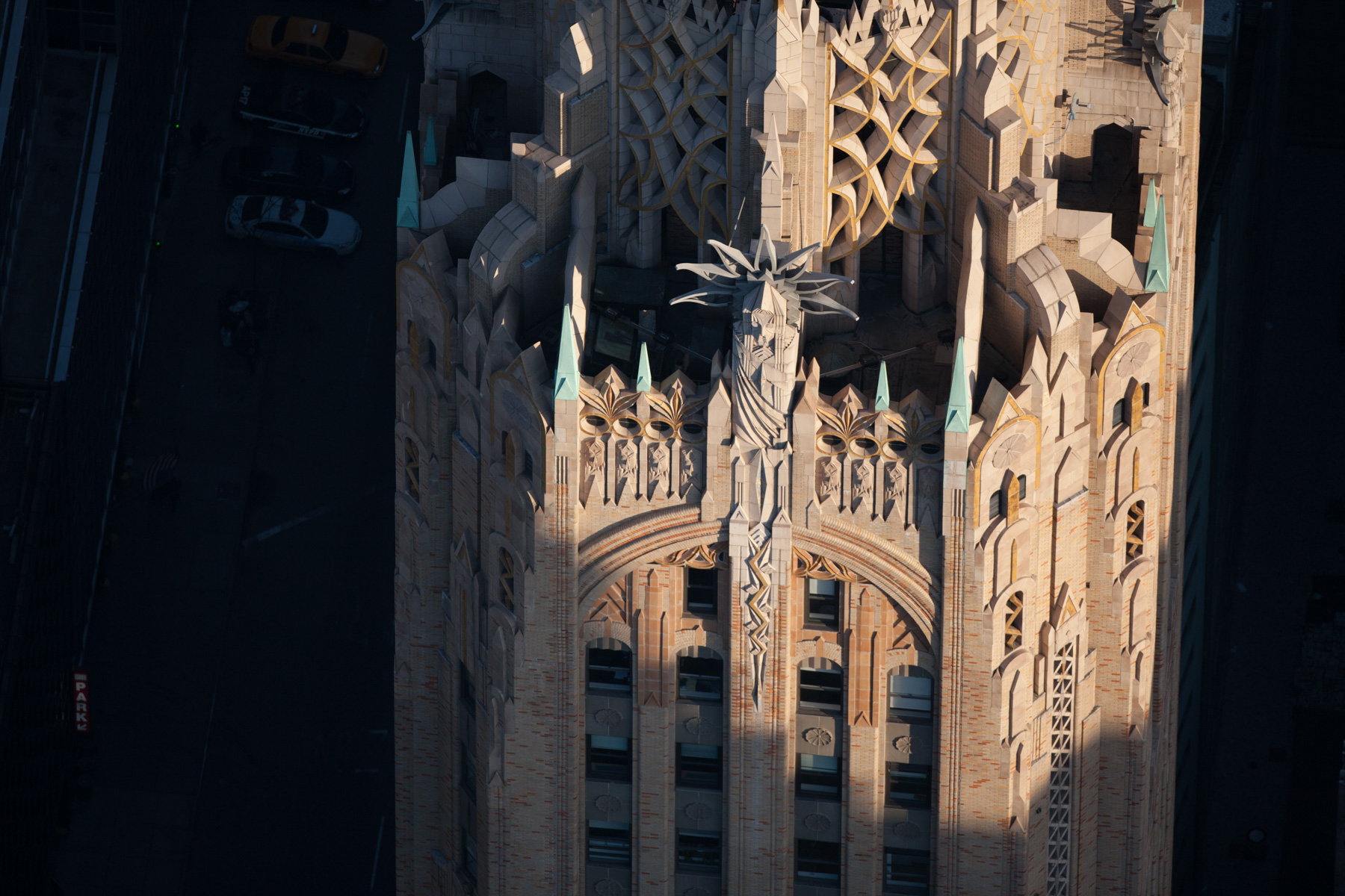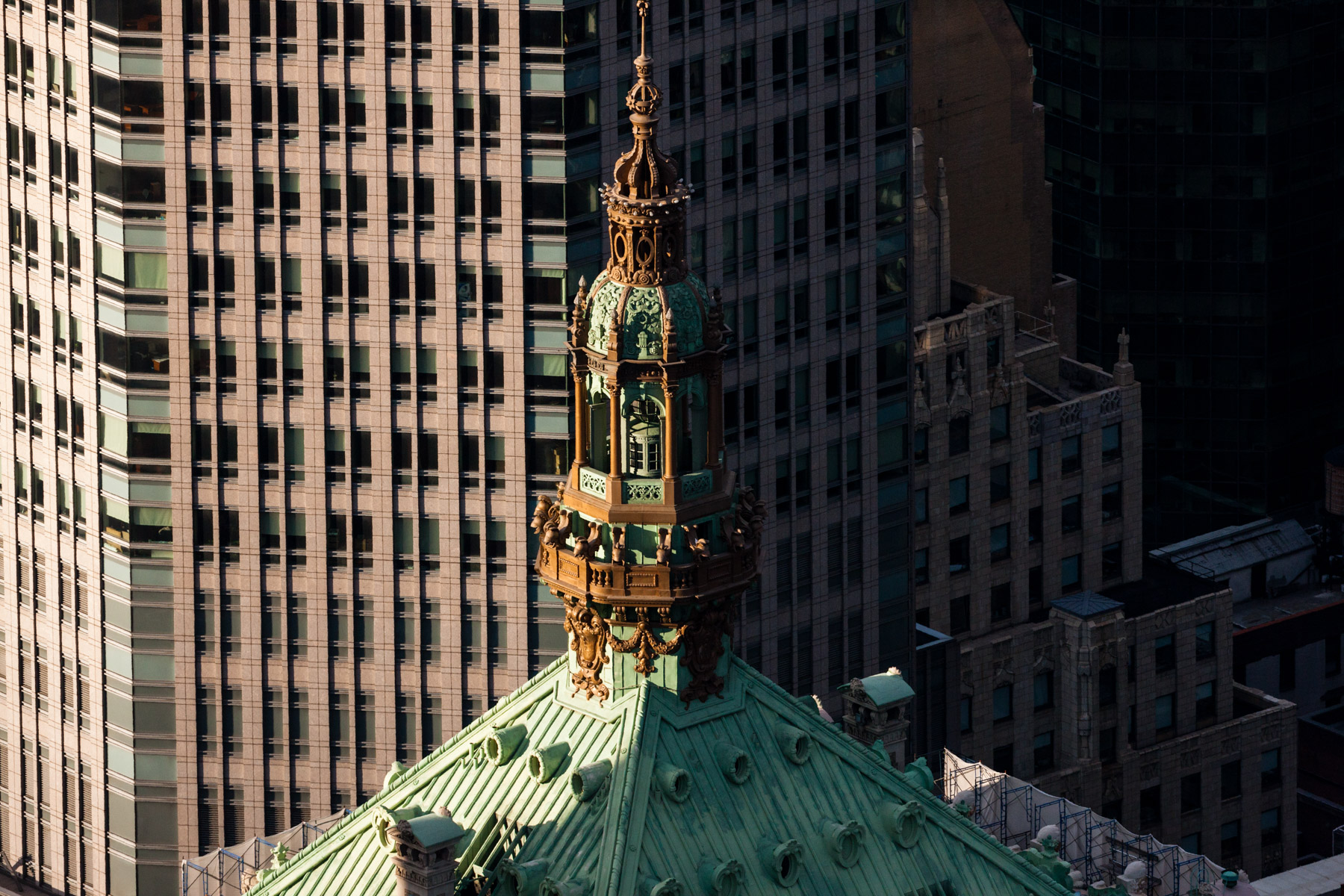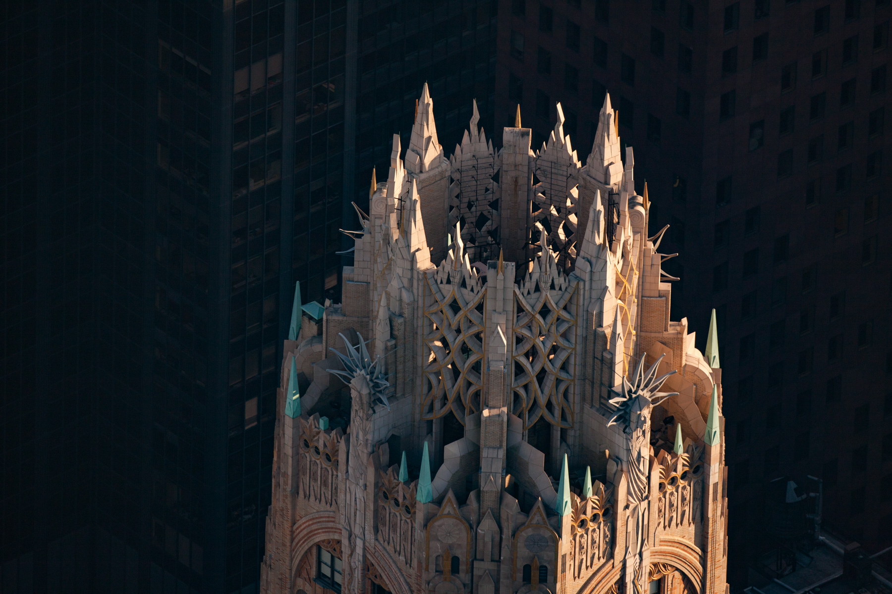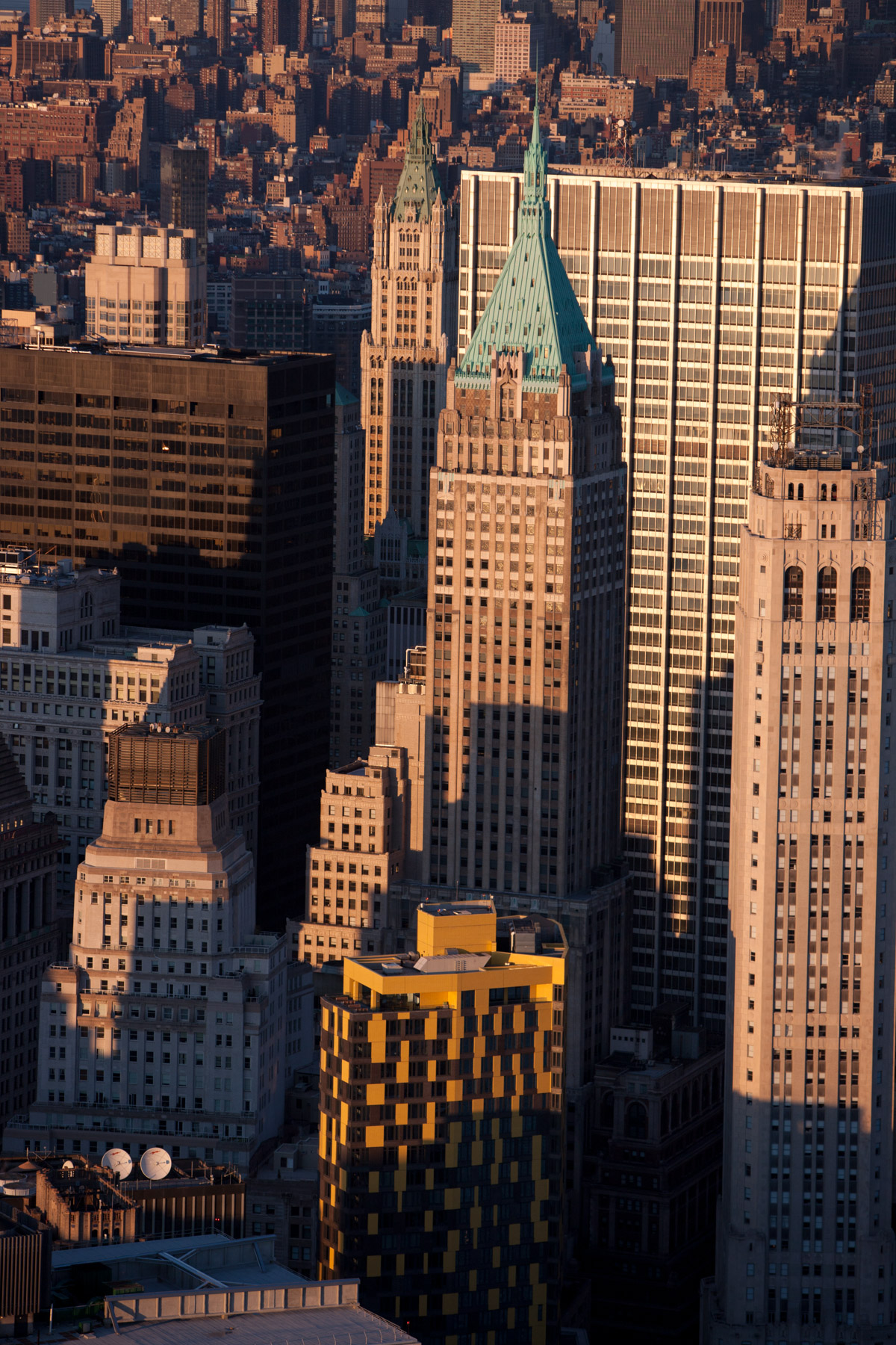 The American International Building or 70 Pine Street and the Woolworth building on the right, Financial District, Manhattan, New York, United States (40°42'22"N, 74°00'31"W).