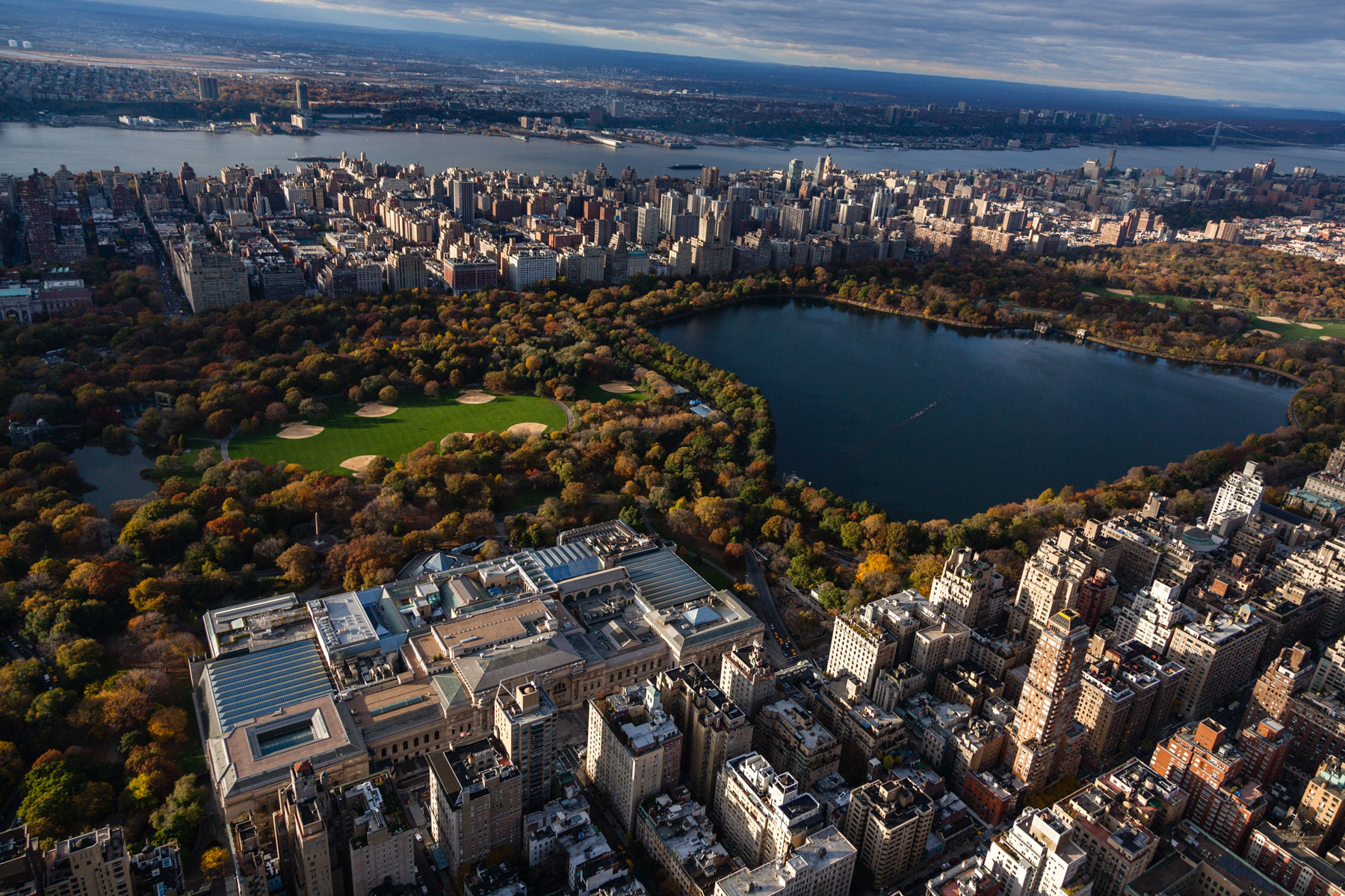 Central Park Reservoir and the Metropolitan Museum of Art, Central Park, Manhattan, New York, United States (40°46'43.26" N, 73°58'6.07" W).
